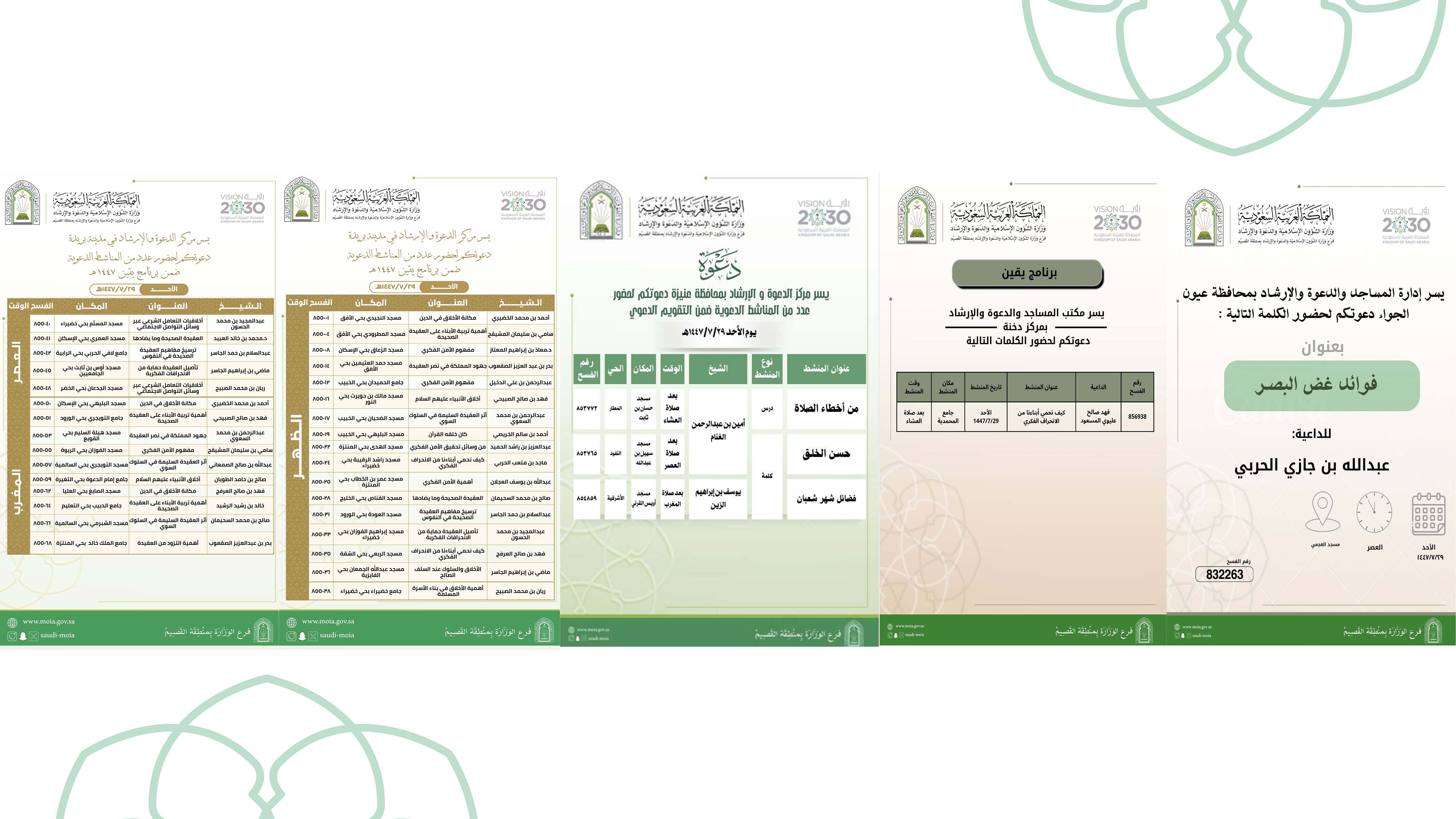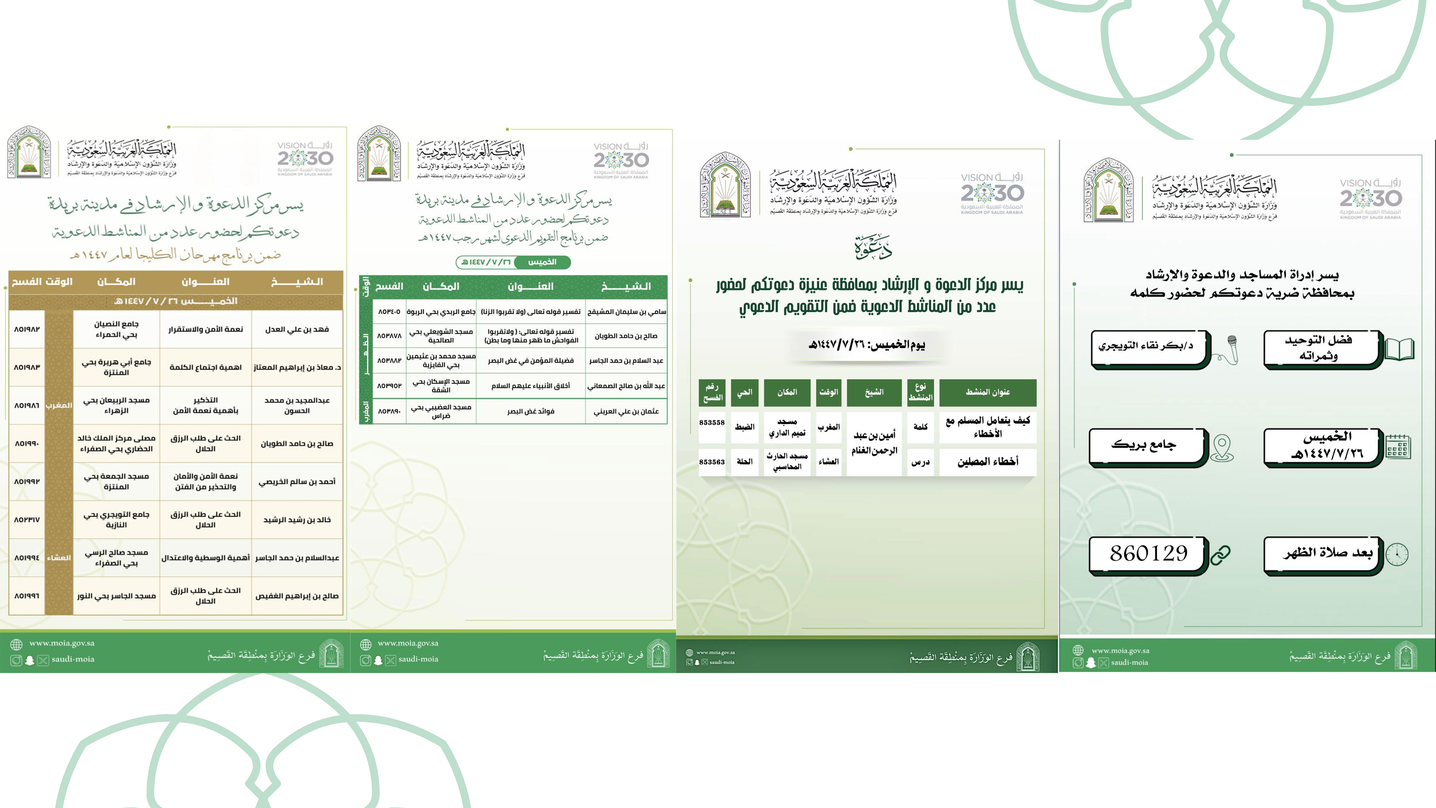 الشؤون الإسلامية بالقصيم تنفذ عددًا من المناشط الدعوية في بريدة وعنيزة وعيون الجواءتنفذ وزارة الشؤون الإسلامية والدعوة والإرشاد، ممثلة بفرعها في منطقة القصيم، ومراكز الدعوة والإرشاد بمدينة بريدة وبمحافظة عنيزة، وإدارة المساجد والدعوة والإرشاد بمحافظتي دخنة وعيون الجواء، اليوم الأحد 29/رجب/1447 التفاصيل
