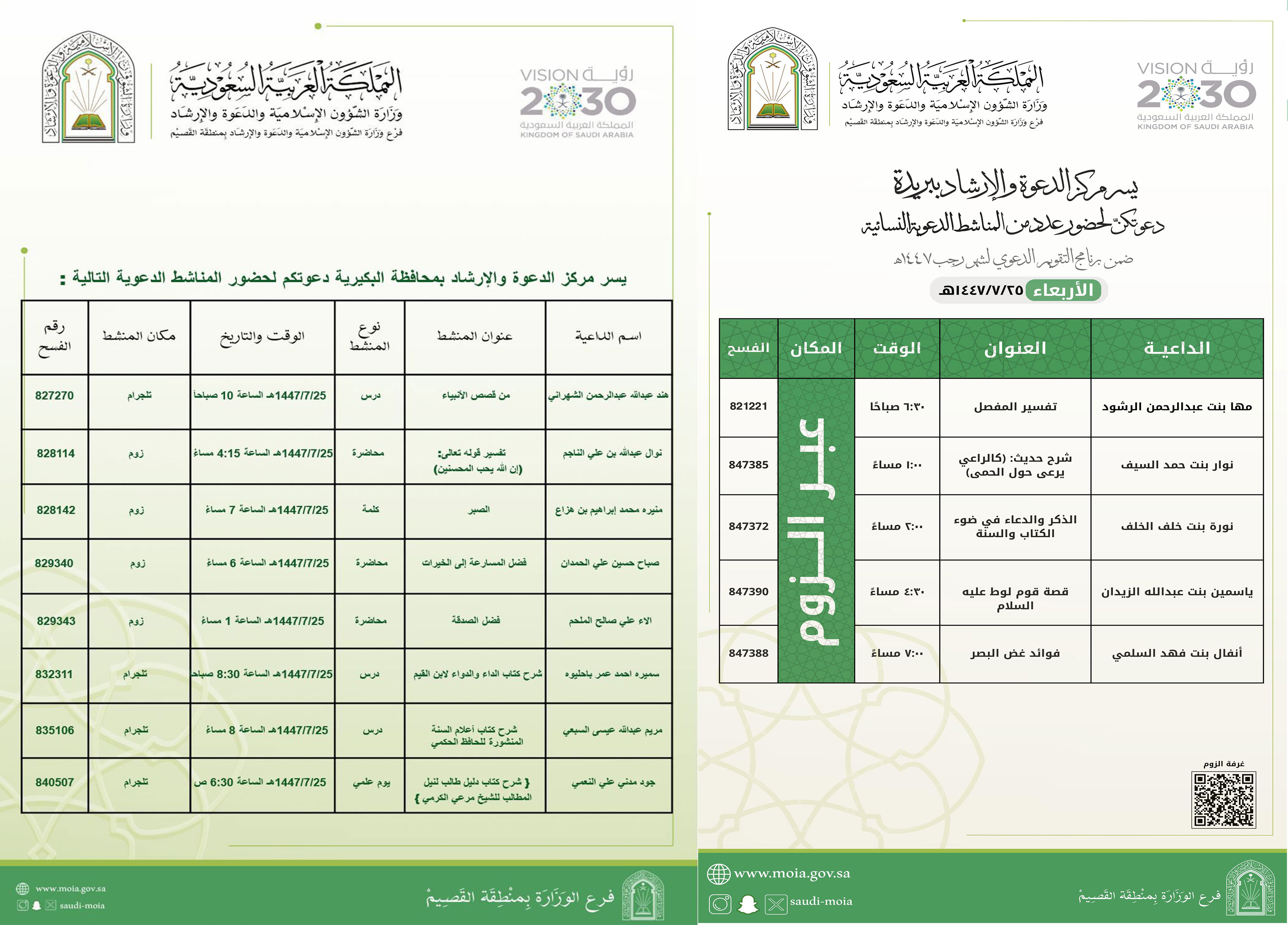 الشؤون الإسلامية بالقصيم تنفذ عددًا من المناشط النسائية ببريدة وعنيزة والبكيريةتنفذ وزارة الشؤون الإسلامية والدعوة والإرشاد ممثلة بفرعها بمنطقة القصيم، ومراكز الدعوة والإرشاد بمدينة بريدة ومحافظتي عنيزة والبكيرية، اليوم الخميس الموافق 26 رجب 1447هـ، عددًا من المناشط النسائية. 26/رجب/1447 التفاصيل