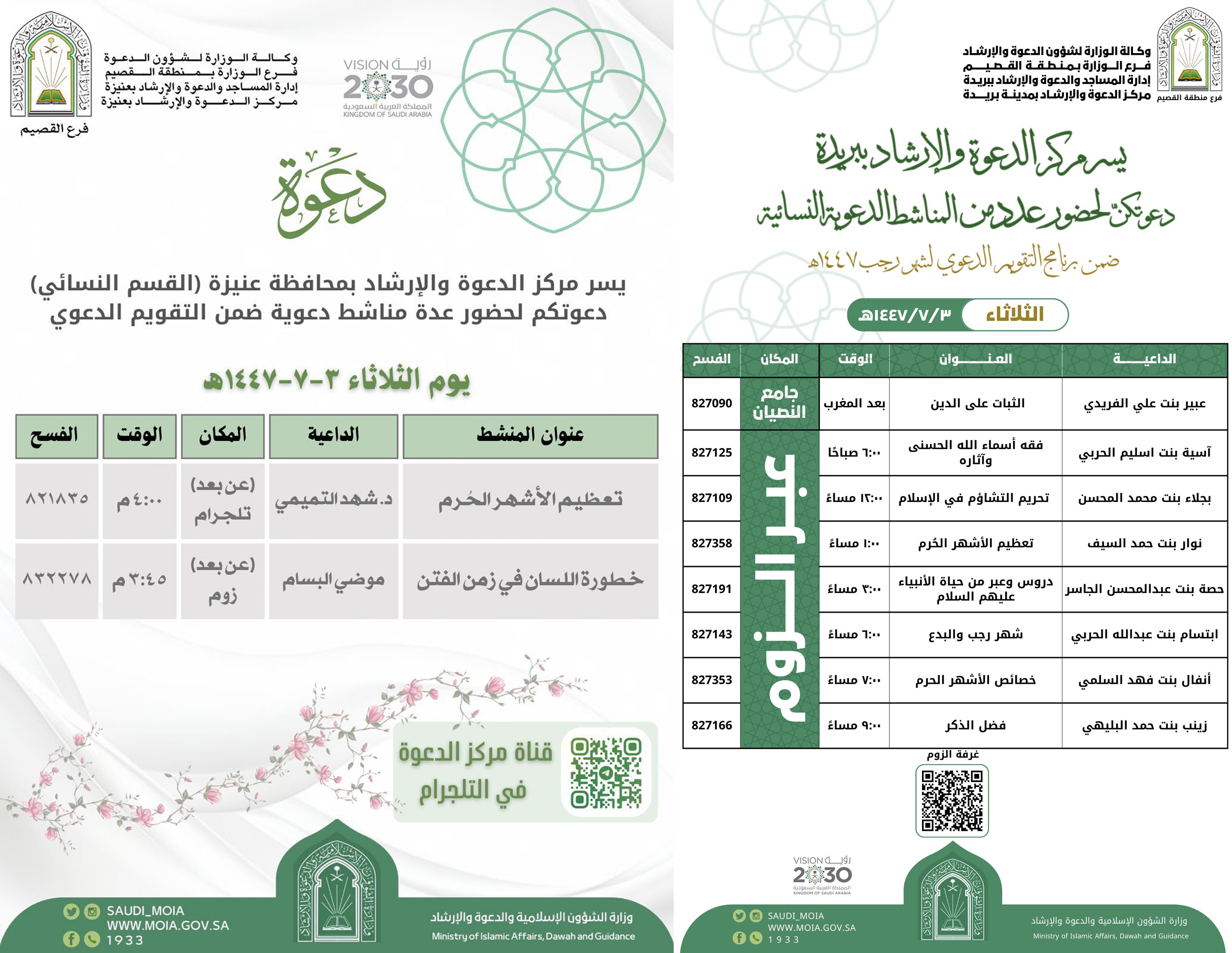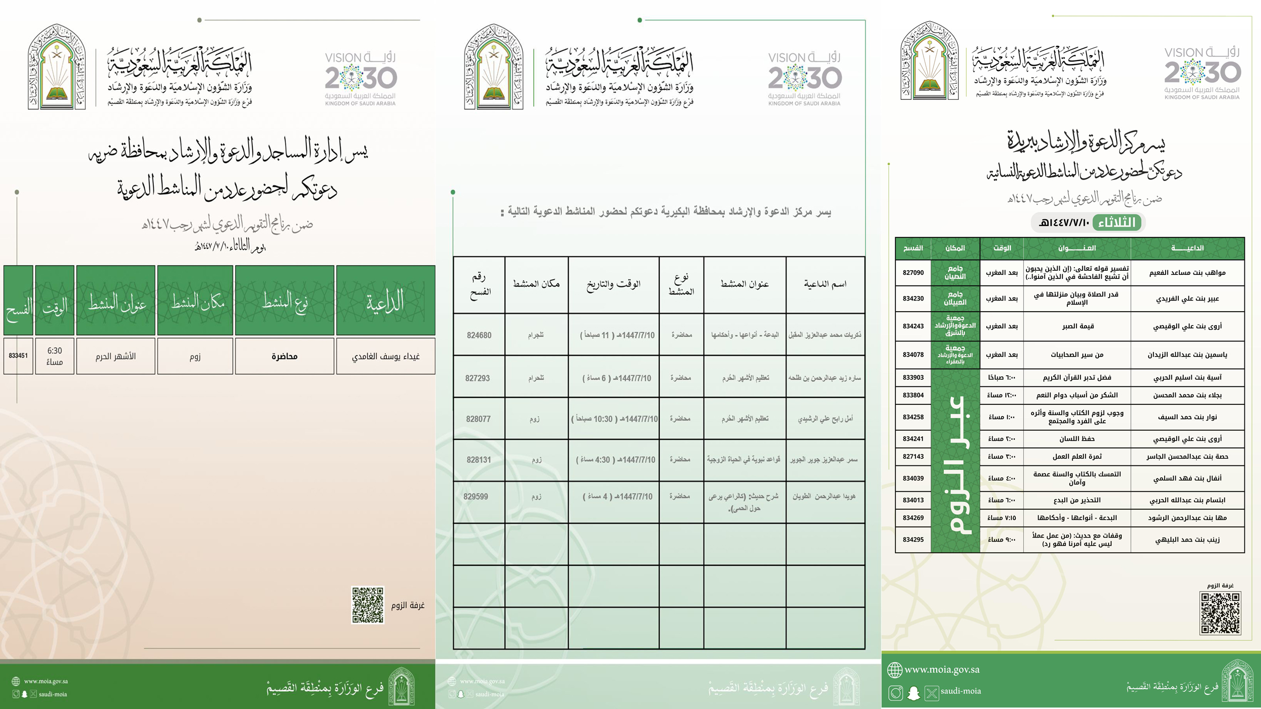الشؤون الإسلامية بالقصيم تنفذ عددا من المناشط النسائية ببريدة والبكيرية وضريةتنفذ وزارة الشؤون الإسلامية والدعوة والإرشاد ممثلة بفرعها بمنطقة القصيم، ومراكز الدعوة والإرشاد بمدينة بريدة، ومحافظة البكرية، وإدارة المساجد والدعوة والإرشاد بمحافظة ضرية ، عدداً من المناشط النسائية 10/رجب/1447 التفاصيل