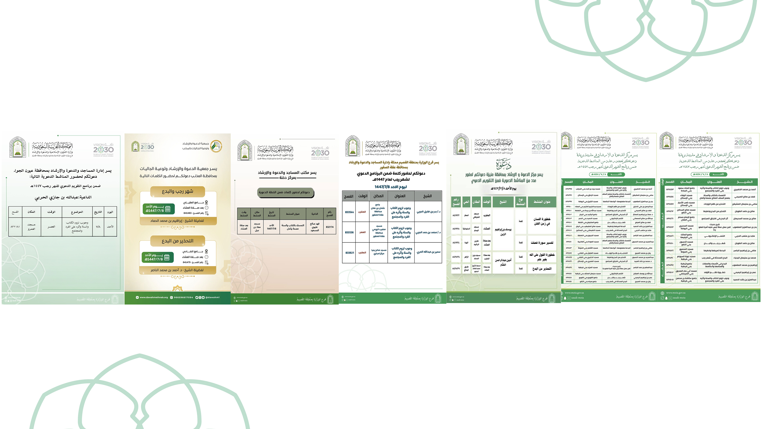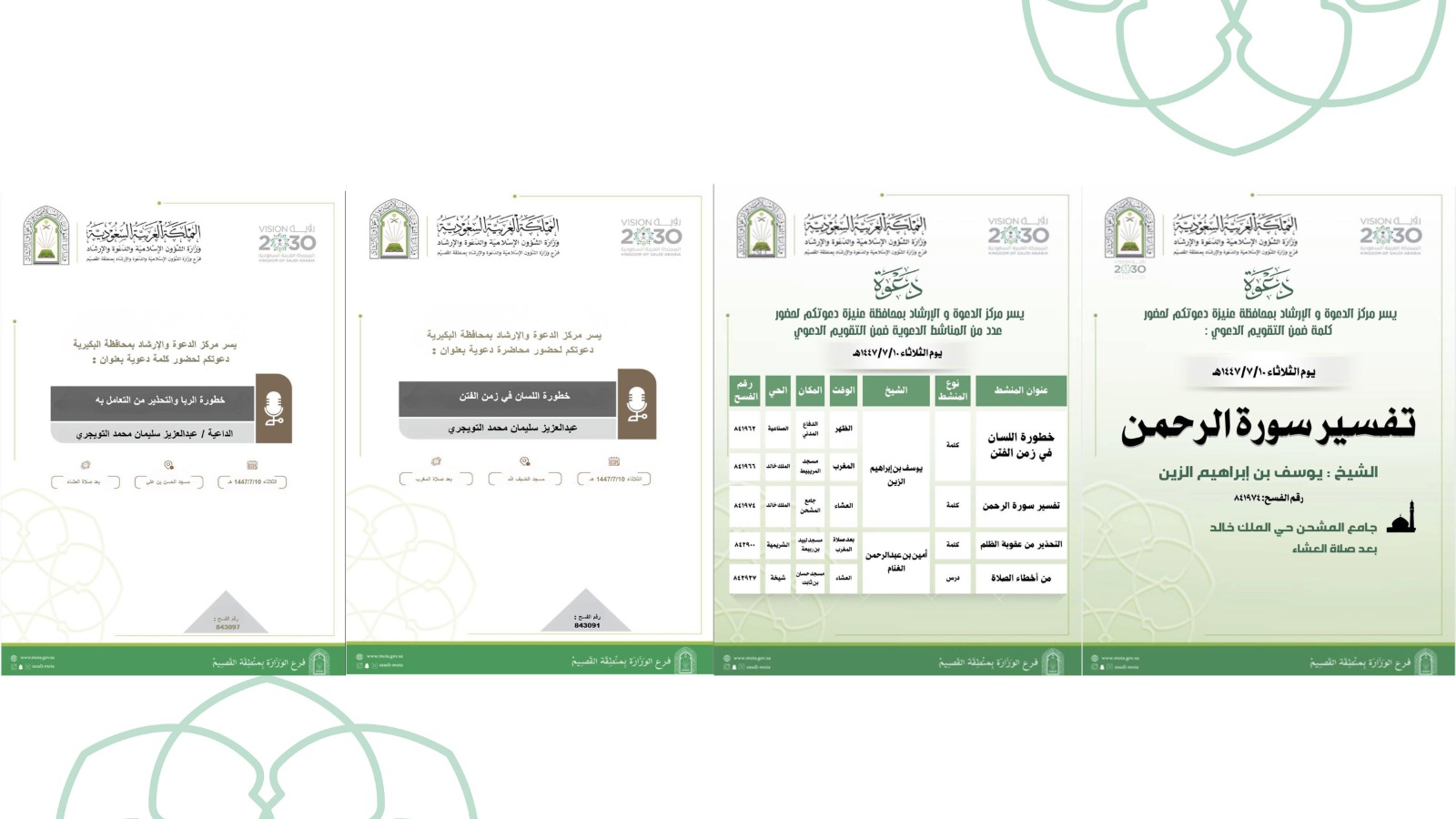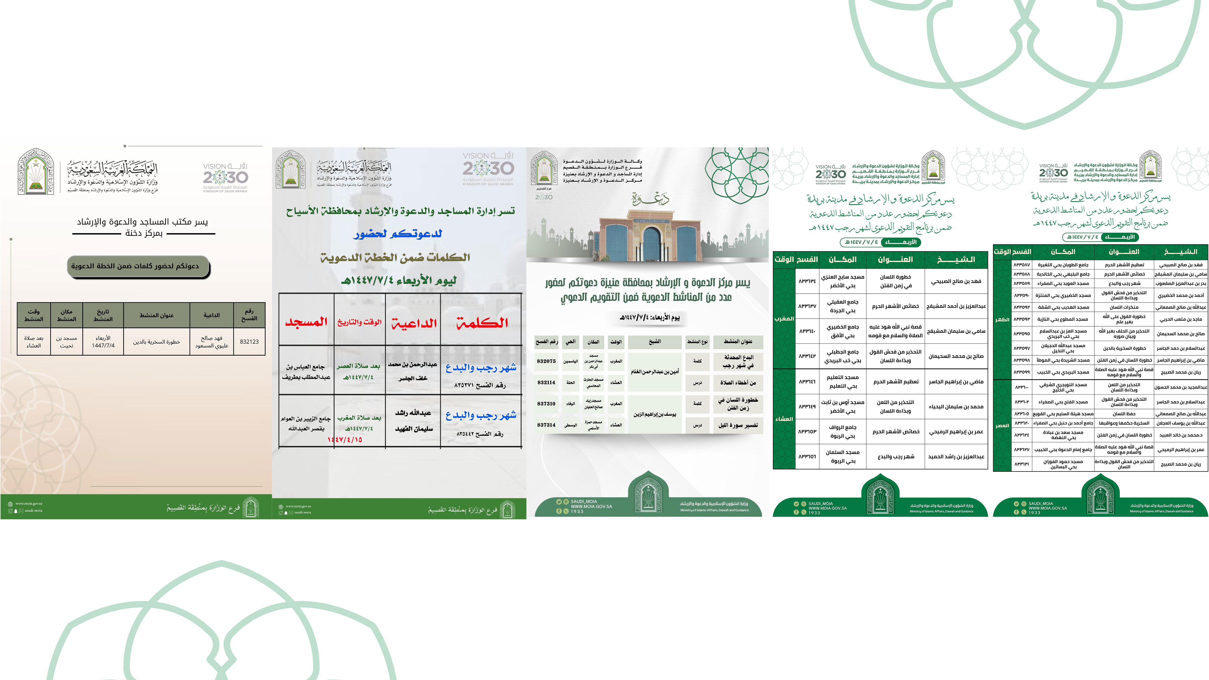 الشؤون الإسلامية بالقصيم تنفذ عددًا من المناشط الدعوية في بريدة ومحافظات عنيزة والأسياح والشماسية ومركز دخنةتنفذ وزارة الشؤون الإسلامية والدعوة والإرشاد ممثلة بفرعها في منطقة القصيم، ومراكز الدعوة والإرشاد بمدينة بريدة ومحافظة عنيزة، وإدارة المساجد والدعوة والإرشاد بمحافظتي الأسياح والشماسية، ومكتب المساجد 05/رجب/1447 التفاصيل