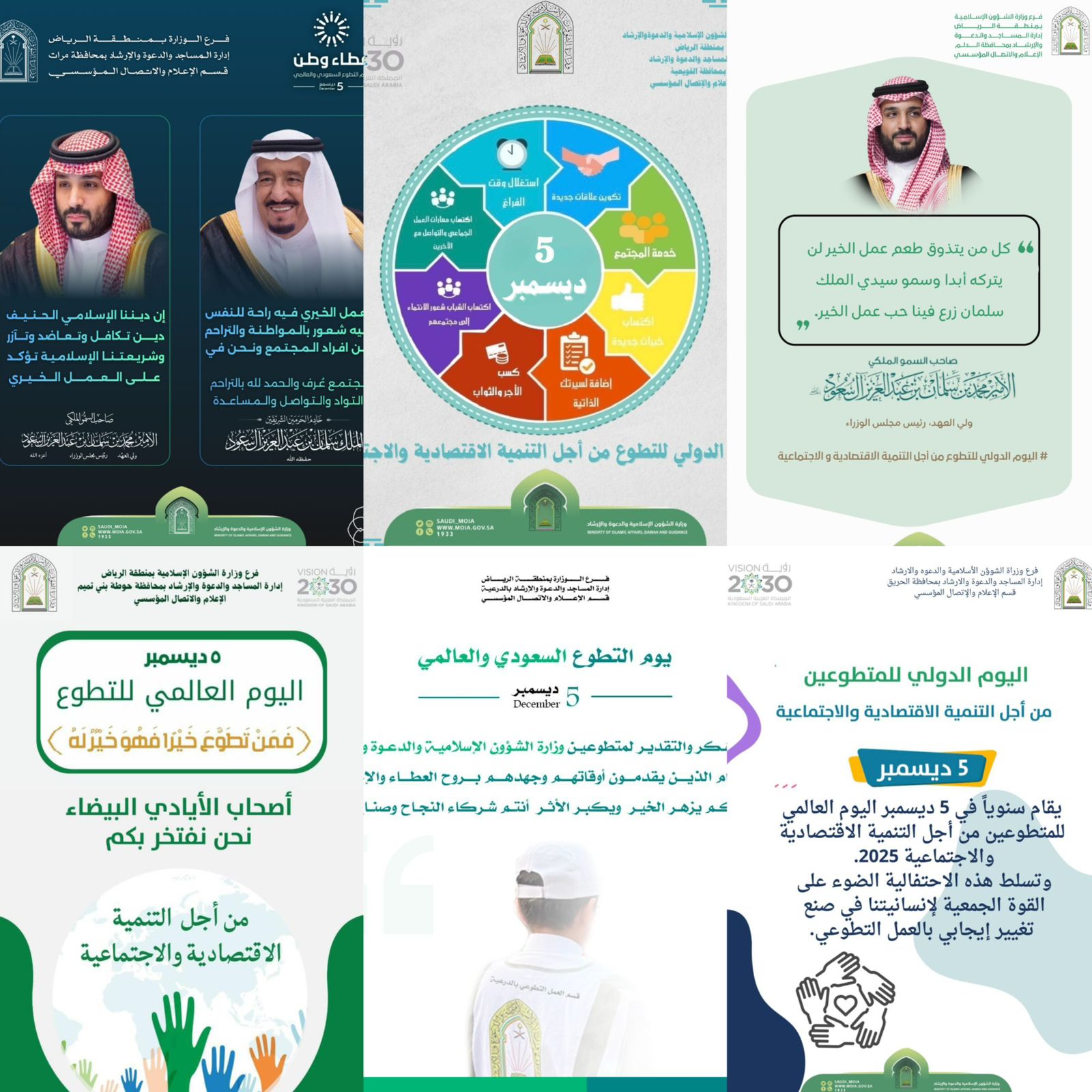 الشؤون الإسلامية بمنطقة الرياض تشارك في فعاليات اليوم العالمي للتطوعMOIA16/جمادى الثانية/1447MOIAالإدارة العامة للإعلام والإتصال المؤسسي شارك وزارة الشؤون الإسلامية والدعوة والإرشاد، ممثلةً بفرعها بمنطقة الرياض إدارات المساجد والدعوة والإرشاد في عددٍ من المحافظات، في فعاليات اليوم العالمي للتطوع، الذي يوافق الخامس من ديسمبر من كل عام، وذلك من خلال تنفيذ مبادرات إعلامية وتوعوية متنوعة تُبرز قيمة العمل التطوعي ودوره في التنمية الاجتماعية والاقتصادية. وقد أعدّت إدارات المساجد تصاميم ومنشورات تعريفية احتفت بهذه المناسبة، تضمّنت كلمات لخادم الحرمين الشريفين وسمو ولي العهد - حفظهما الله - ـ التي تؤكد مكانة العمل الخيري والتطوعي في بناء الإنسان وتنمية المجتمع، وتعزز روح التكافل بين أفراده. كما سلطت التصاميم الضوء على أهمية التطوع كقيمة وطنية راسخة، ودوره في تمكين المتطوعين وإبراز جهودهم في شتى المجالات، إلى جانب تعزيز الوعي بثقافة العطاء، وتوثيق ما يقدمه المتطوعون من مساهمات نوعية تدعم مجال التنمية المستدامة. ويأتي ذلك ضمن جهود فرع الوزارة بمنطقة الرياض، في تفعيل المناسبات الوطنية والعالمية ذات الارتباط برسالة المسجد ودوره المجتمعي، وتعزيز الشراكة المجتمعية من خلال إبراز المبادرات التطوعية والبرامج الهادفة لخدمة بيوت الله والمجتمع.