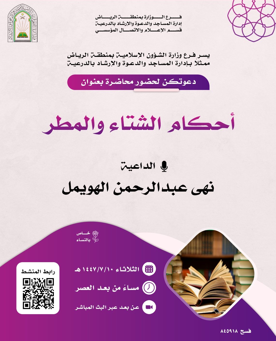 الشؤون الإسلامية بالرياض تنفذ محاضرة دعوية نسائية بمحافظة الدرعية اليوم العاشر من شهر رجبMOIA10/رجب/1447MOIAنفذت وزارة الشؤون الإسلامية والدعوة والإرشاد، ممثلةً بفرعها بمنطقة الرياض ـ إدارة المساجد والدعوة والإرشاد بمحافظة الدرعية ـ، اليوم الثلاثاء، العاشر من شهر رجب من العام ١٤٤٧ هـ، محاضرة دعوية نسائية عن بُعد عبر البث المباشر بعنوان: "أحكام الشتاء والمطر"، بعد صلاة العصر، حيث سلّطت المحاضرة الضوء على الأحكام الشرعية المتعلقة بالشتاء والمطر، مع بيان أهميتها ودورها في توجيه سلوك المرأة المسلمة في حياتها اليومية. وتأتي هذه المحاضرة ضمن جهود فرع الوزارة بمنطقة الرياض، المستمرة في نشر الوعي الديني وتعزيز القيم الإسلامية وترسيخ المبادئ الشرعية بين النساء في جميع محافظات المنطقة.