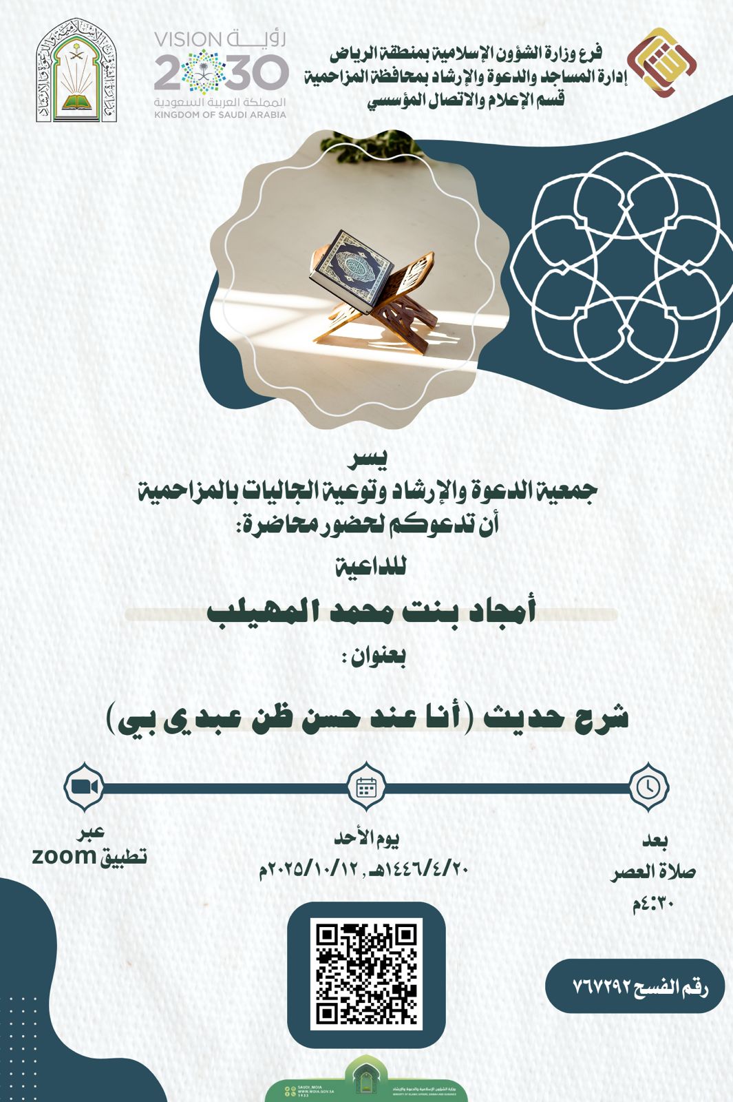 الشؤون الإسلامية بالرياض تنفذ محاضرة نسائية بالمزاحمية وكلمة دعوية بالدوادمينفذ فرع وزارة الشؤون الإسلامية والدعوة والإرشاد بمنطقة الرياض، ممثلاً بقسم الدعوة بإدارة المساجد والدعوة والإرشاد بمحافظة المزاحمية، يوم الأحد العشرين من شهر ربيع الآخر لعام 1447هـ، محاضرة نسائية 21/ربيع الثاني/1447 التفاصيلفرع الشؤون الإسلامية بالرياض ينفذ عددًا من المناشط الدعوية في محافظات المنطقةنفذ فرع وزارة الشؤون الإسلامية والدعوة والإرشاد بمنطقة الرياض، خلال الفترة من يوم الأربعاء السادس عشر وحتى اليوم الأحد العشرين من شهر ربيع الآخر 1447هـ، عددًا من المناشط الدعوية في مختلف محافظات المنطقة 20/ربيع الثاني/1447 التفاصيل « 56789101112131415 »