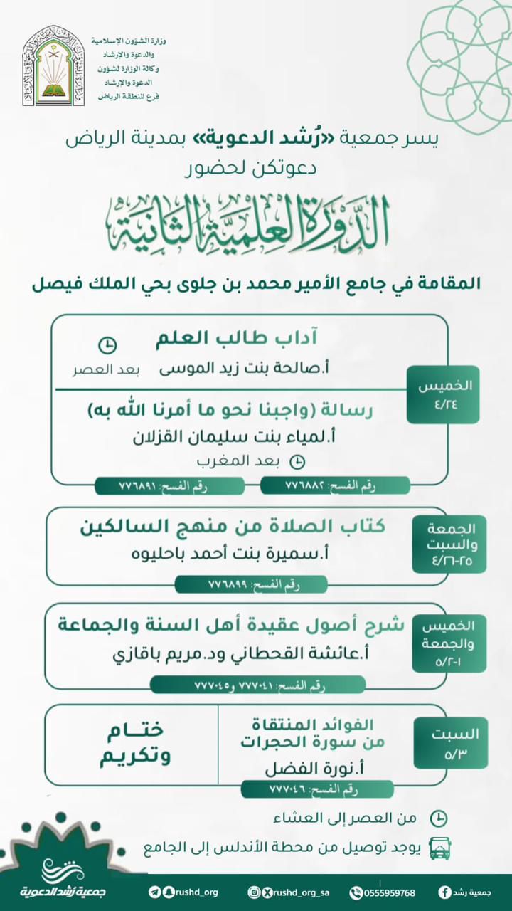 الشؤون الإسلامية بالرياض تنظم الدورة العلمية الثانية بالتعاون مع جمعية “رُشد الدعوية”تنظم وزارة الشؤون الإسلامية والدعوة والإرشاد، ممثلة بفرعها في منطقة الرياض، بالتعاون مع جمعية “رُشد الدعوية”، الدورة العلمية الثانية، وذلك في جامع الأمير محمد بن جلوي بحي الملك فيصل بمدينة الرياض، خلال 23/ربيع الثاني/1447 التفاصيل