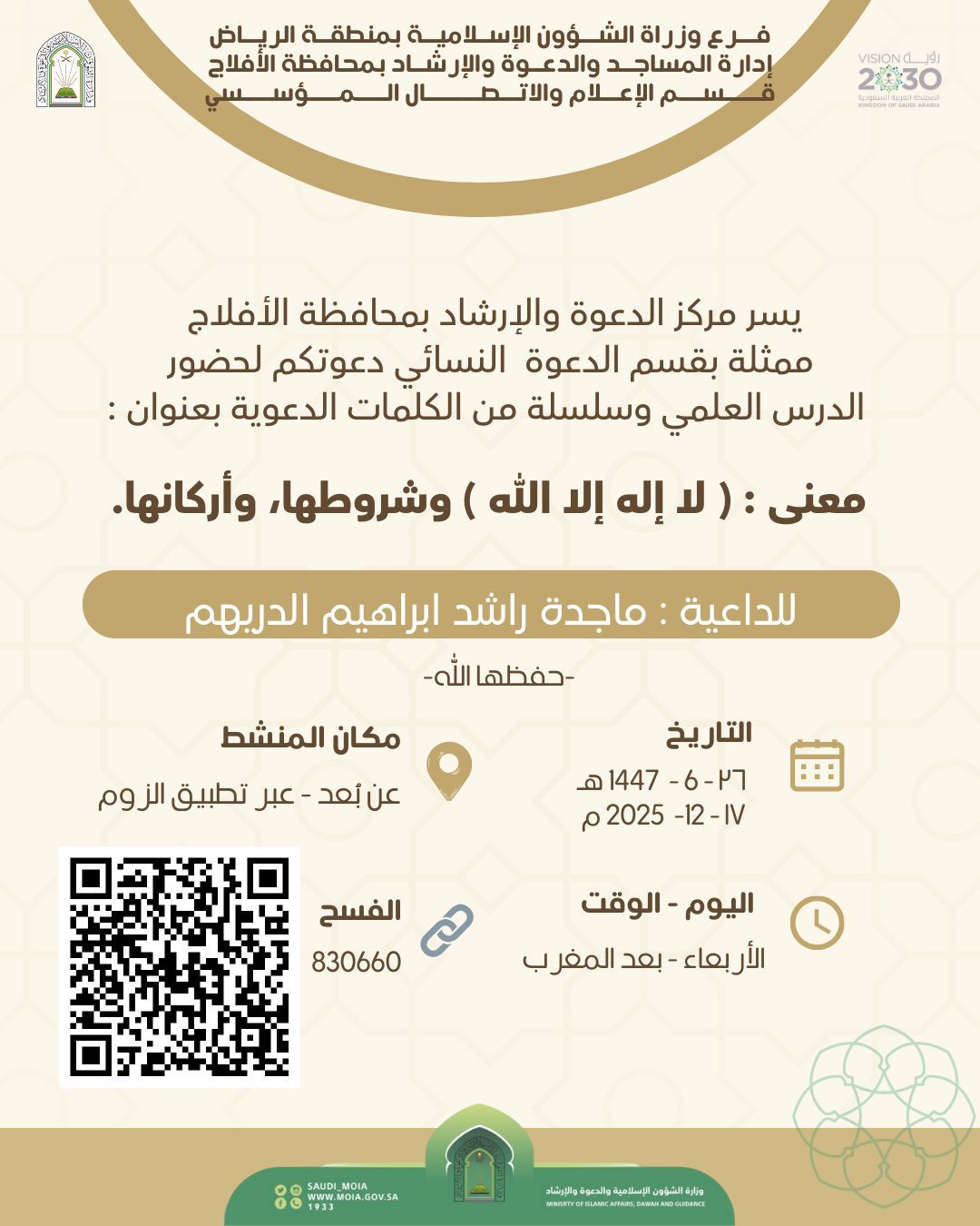 الشؤون الإسلامية بالرياض تنفذ سلسلة من الكلمات الدعوية النسائية بمحافظتي الأفلاج والمزاحمية نفذت وزارة الشؤون الإسلامية والدعوة والإرشاد، ممثلةً بفرعها بمنطقة الرياض، إدارة المساجد والدعوة والإرشاد، خلال الفترة من يوم الأربعاء السادس والعشرين، وحتى يوم السبت التاسع والعشرين من شهر جمادى الآخرة 01/رجب/1447 التفاصيل