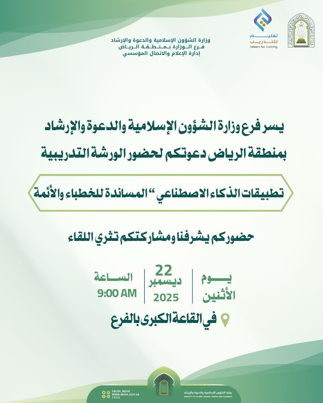 فرع الشؤون الإسلامية بالرياض يطلق ورشة عمل حول الذكاء الاصطناعي في الخطابة والدعوة تُقيم وزارة الشؤون الإسلامية والدعوة والإرشاد، ممثّلةً بفرعها في منطقة الرياض، يوم غدٍ الاثنين 2 رجب 1447هـ، في القاعة الكبرى بمقر الفرع، عند الساعة 9:00 صباحًا، ورشة عمل بعنوان الذكاء الاصطناعي 01/رجب/1447 التفاصيل
