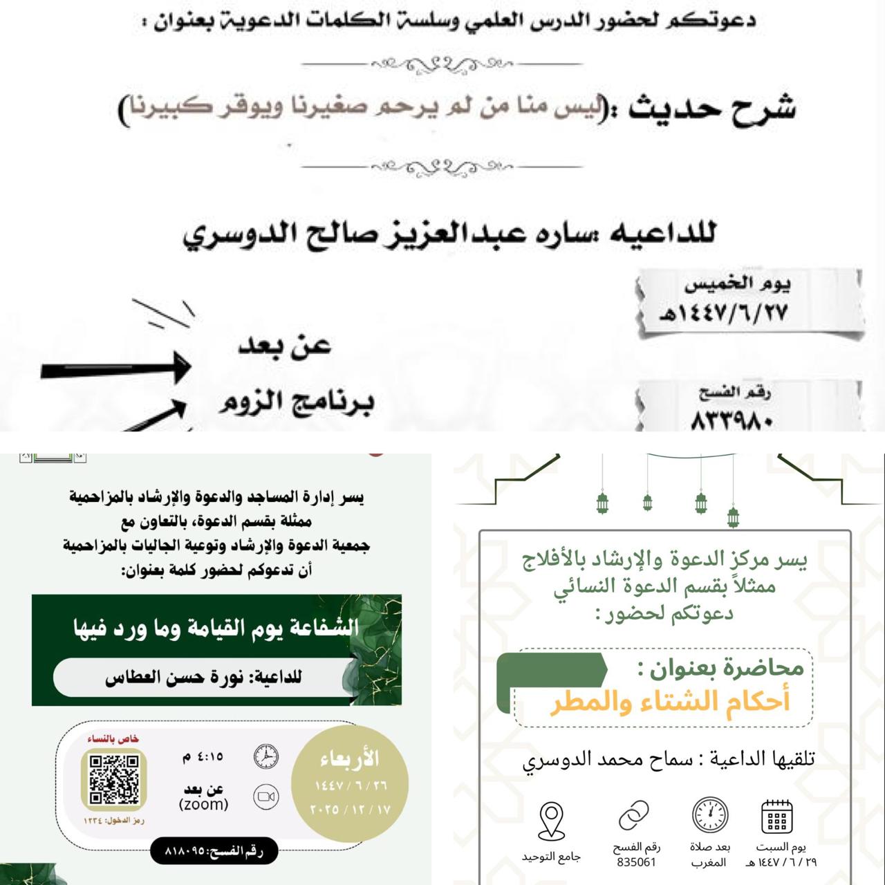 الشؤون الإسلامية بالرياض تنفذ سلسلة من المناشط الدعوية بمحافظتي ثادق والدوادمينفّذت وزارة الشؤون الإسلامية والدعوة والإرشاد، ممثلةً بفرعها بمنطقة الرياض ـ قسم الدعوة التابع لإدارة المساجد والدعوة والإرشاد -، يوم الأحد الأول من شهر رجب لعام 1447هـ، سلسلة من المناشط الدعوية المتنوعة، 02/رجب/1447 التفاصيل