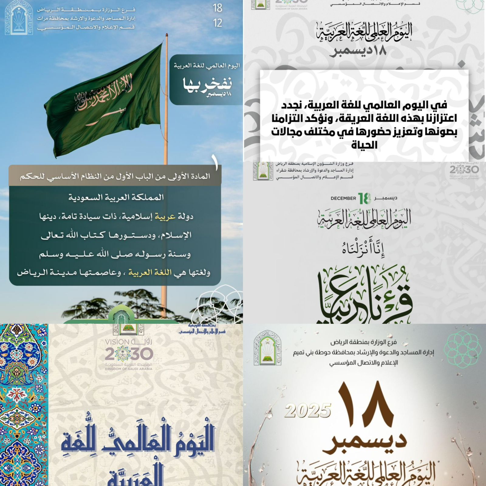فرع الشؤون الإسلامية بالرياض تشارك في فعاليات اليوم العالمي للغة العربية بمنطقة الرياضشاركت وزارة الشؤون الإسلامية والدعوة والإرشاد، ممثلةً بفرعها بمنطقة الرياض، ـ إدارات المساجد والدعوة والإرشاد في المحافظات ـ، يوم الخميس التاسع والعشرين من شهر جمادى الأولى ١٤٤٧هـ، في فعاليات اليوم العالمي 27/جمادى الثانية/1447 التفاصيل