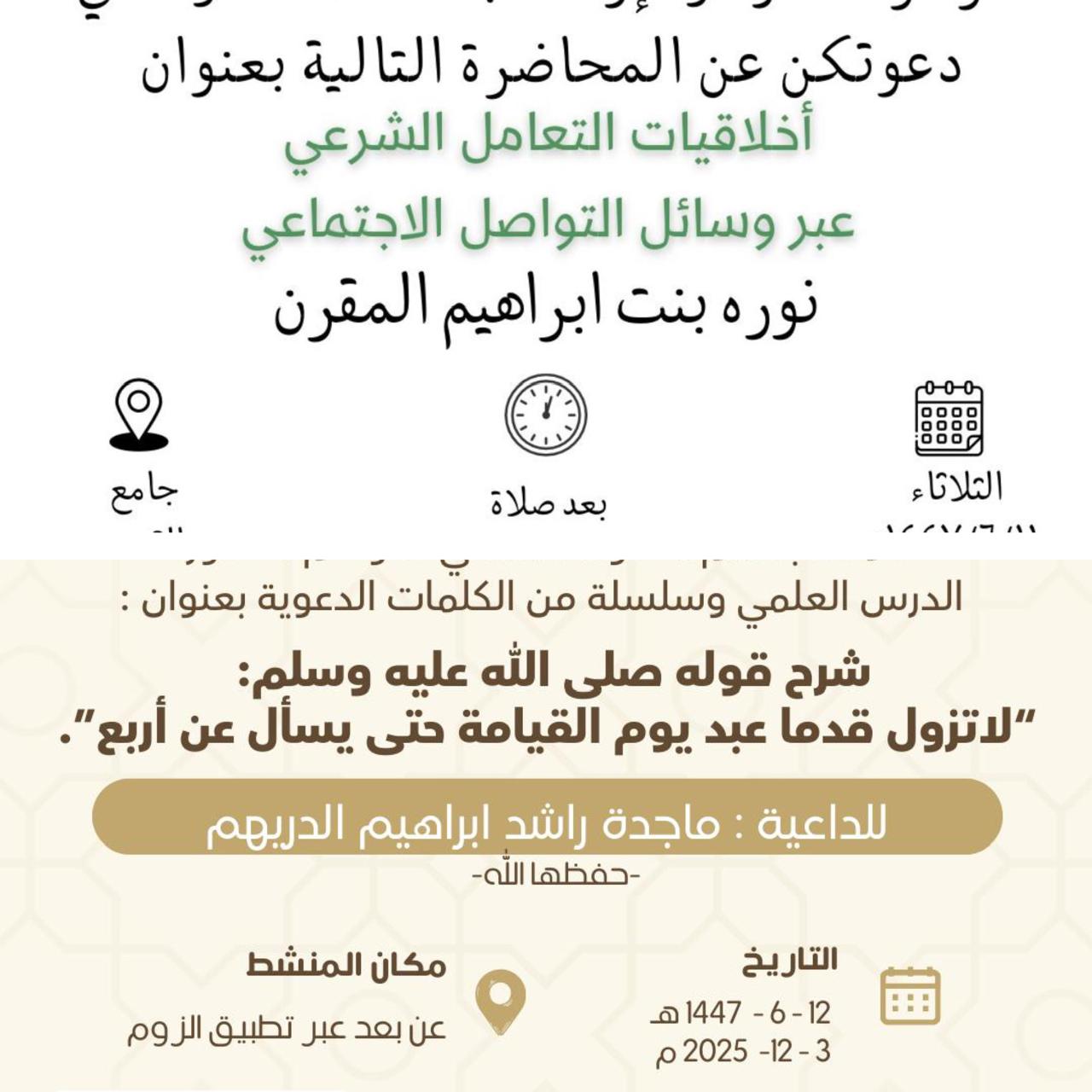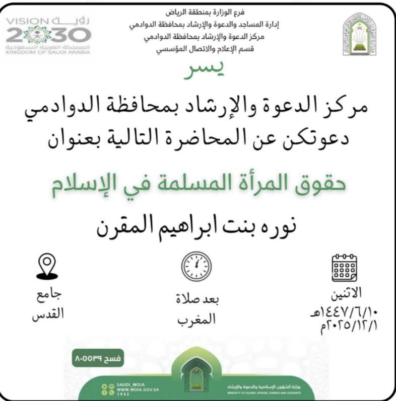 الشؤون الإسلامية بالرياض تنفذ محاضرة نسائية بمحافظة الدوادمينفذت وزارة الشؤون الإسلامية والدعوة والإرشاد، ممثلة بفرعها بمنطقة الرياض مركز الدعوة والإرشاد بمحافظة الدوادمي، يوم الاثنين العاشر من شهر جمادى الآخرة ١٤٤٧هـ، محاضرة دعوية نسائية بعنوان: "حقوق 11/جمادى الثانية/1447 التفاصيل