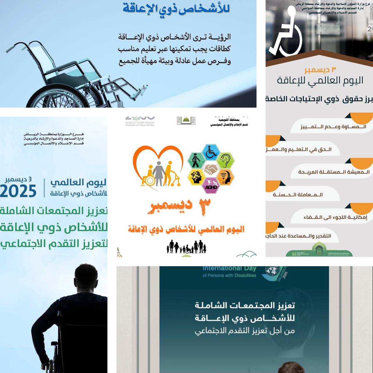 الشؤون الإسلامية بالرياض تشارك باليوم العالمي لذوي الإعاقةشاركت وزارة الشؤون الإسلامية والدعوة والإرشاد، ممثلةً بفرعها بمنطقة الرياض، إدارات المساجد والدعوة والإرشاد في المحافظات، اليوم الأربعاء الثاني عشر من شهر جمادى الآخرة من عام ١٤٤٧هـ، في فعاليات اليوم 12/جمادى الثانية/1447 التفاصيل