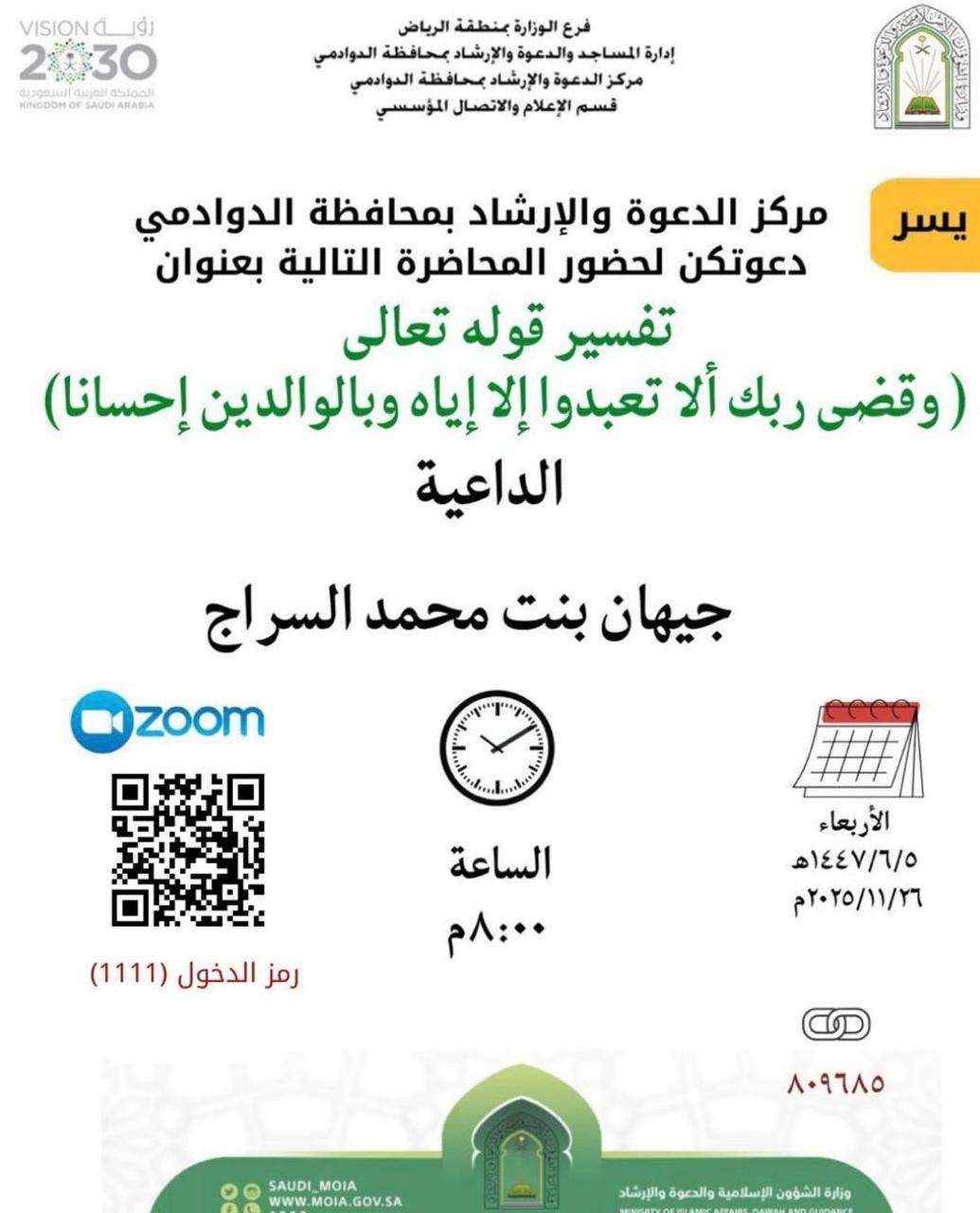 فرع الشؤون الإسلامية بالرياض ينفذ محاضرة نسائية بمحافظة الدوادمي نفذ فرع وزارة الشؤون الإسلامية والدعوة والإرشاد بمنطقة الرياض، ممثلاً بقسم الدعوة في إدارة المساجد والدعوة والإرشاد بمحافظة الدوادمي، يوم الأربعاء الخامس من شهر جمادى الآخرة ١٤٤٧هـ، محاضرة نسائية لتفسير 06/جمادى الثانية/1447 التفاصيل