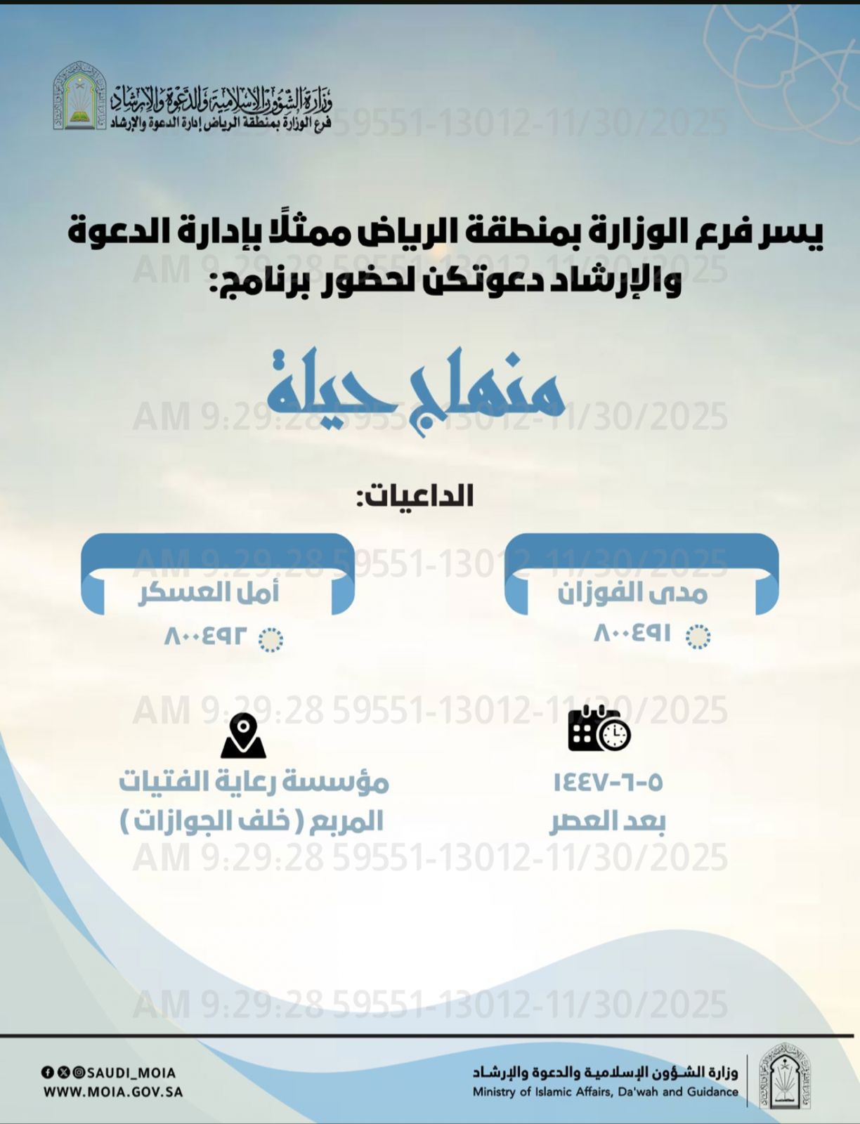 فرع الشؤون الإسلامية بالرياض ينفّذ برنامجاً دعوياً بعنوان "منهاج حياة" بمؤسسة رعاية الفتيات بالمربعنفذ فرع الشؤون الإسلامية والدعوة والإرشاد بمنطقة الرياض، ممثلاً بإدارة الدعوة والإرشاد بفرع الوزارة بمنطقة الرياض، يوم الأربعاء الخامس من شهر جمادى الآخرة ١٤٤٧هـ، برنامجًا دعويًا بعنوان: "منهاج 09/جمادى الثانية/1447 التفاصيل