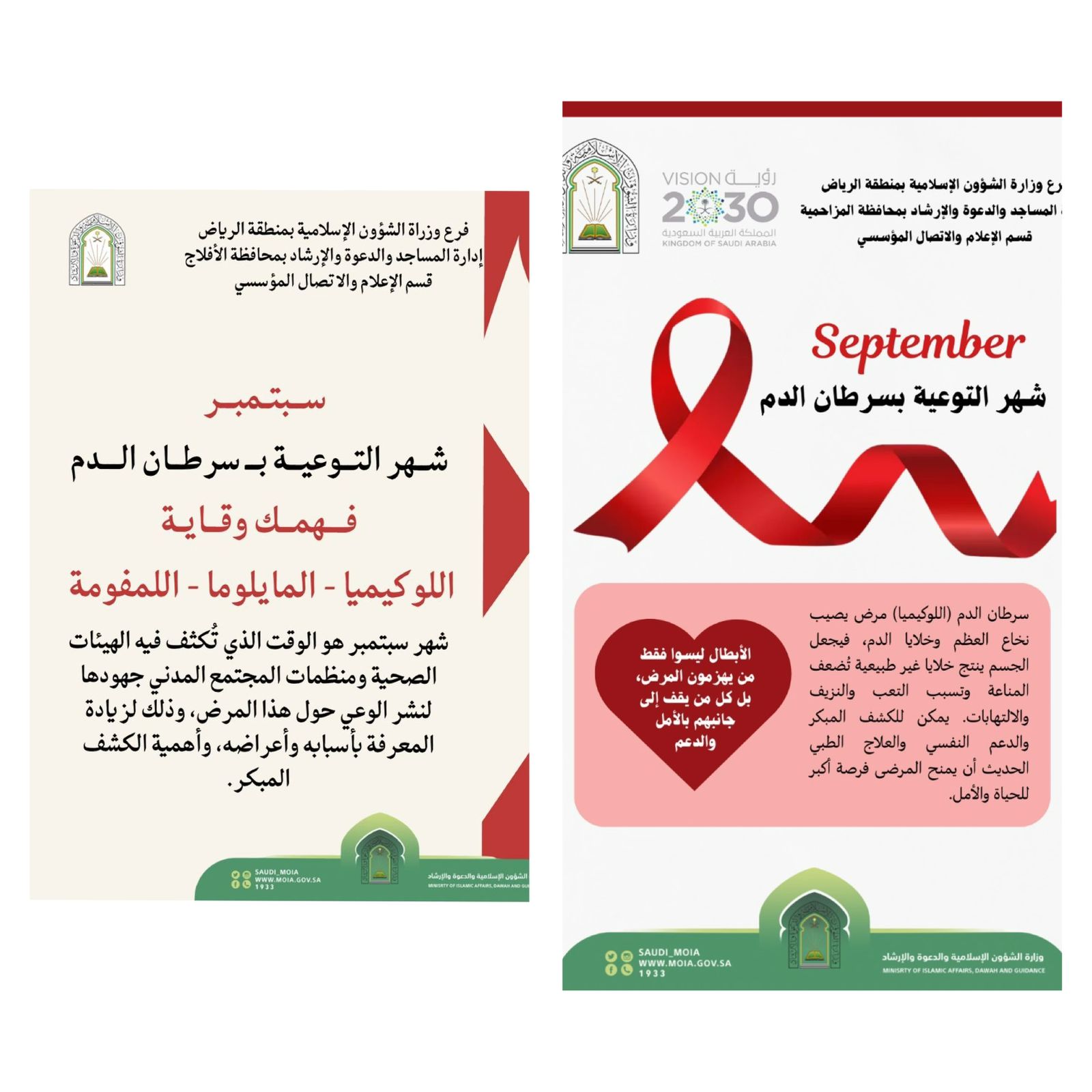 فرع وزارة الشؤون الإسلامية بالرياض يشارك في الحملة العالمية للتوعية بسرطان الدمشارك فرع وزارة الشؤون الإسلامية والدعوة والإرشاد بمنطقة الرياض، ممثلاً في إدارة المساجد والدعوة والإرشاد، في الحملة التوعوية العالمية لشهر سبتمبر، المخصصة للتعريف بمرض سرطان الدم وأنواعه المختلفة. وجاءت 22/ربيع الأول/1447 التفاصيل