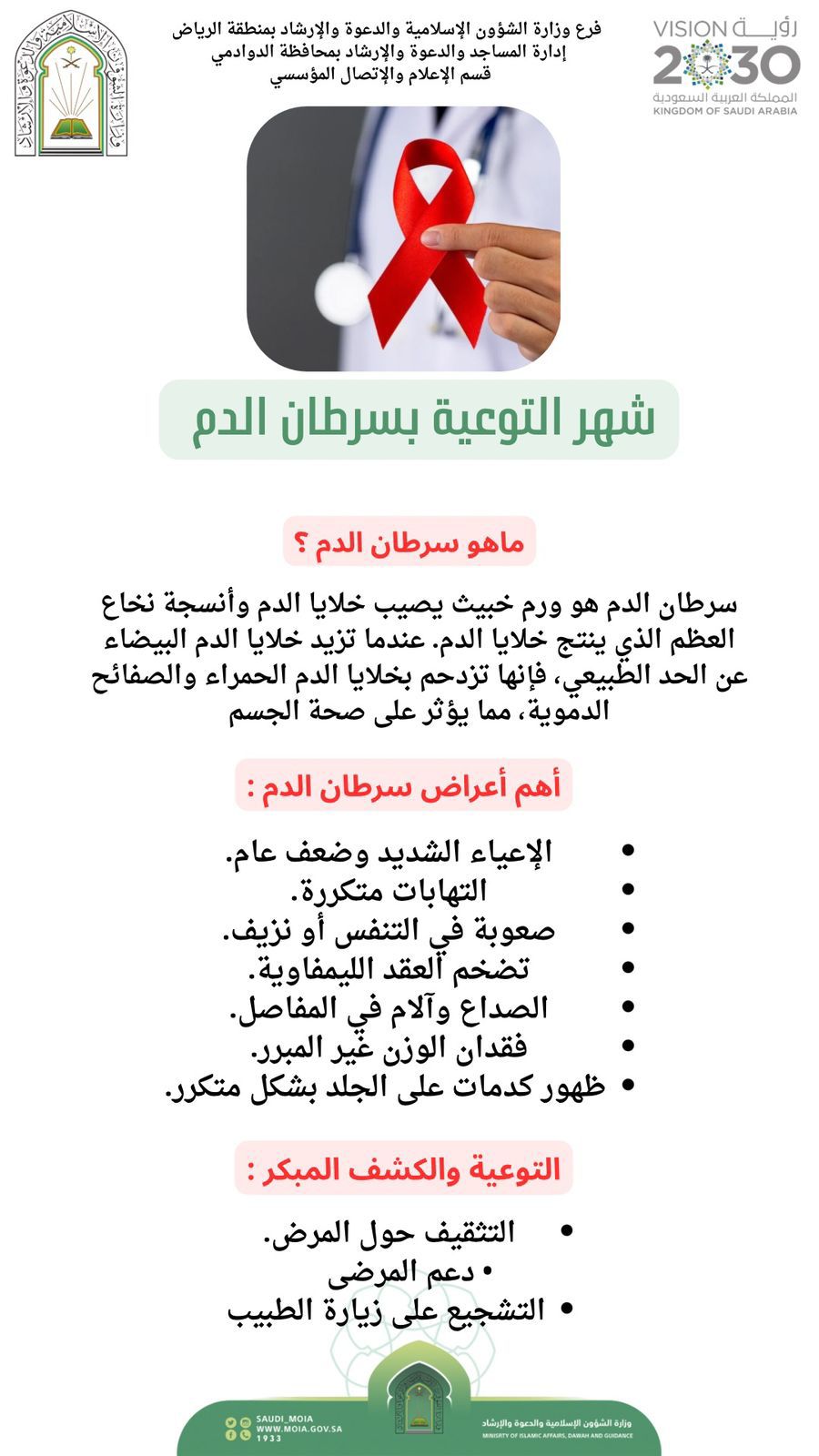 الشؤون الإسلامية بالرياض تطلق حملة توعوية عن سرطان الدم بالدوادميأطلق فرع وزارة الشؤون الإسلامية والدعوة والإرشاد بمنطقة الرياض، ممثلًا بإدارة المساجد والدعوة والإرشاد بمحافظة الدوادمي، حملة توعوية بمناسبة شهر التوعية بسرطان الدم، من خلال تصميم توعوي يجسّد الرسائل 24/ربيع الأول/1447 التفاصيل