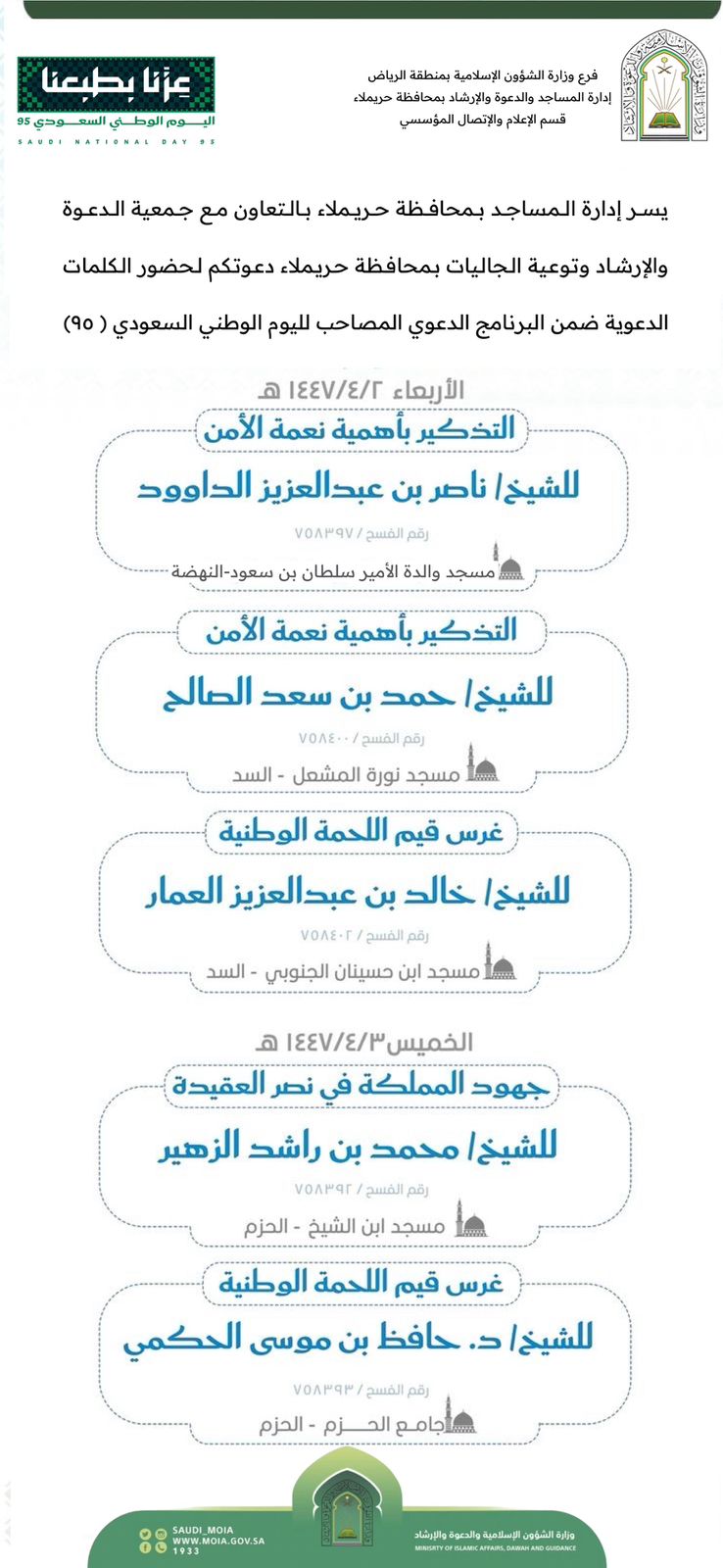 "الشؤون الإسلامية" بالرياض تنفذ كلمات دعوية بمناسبة اليوم الوطني الـ95 بحريملاءينفذ فرع وزارة الشؤون الإسلامية والدعوة والإرشاد بمنطقة الرياض، ممثلاً بإدارة المساجد والدعوة والإرشاد بمحافظة حريملاء، وبالتعاون مع جمعية الدعوة والإرشاد وتوعية الجاليات، كلمات توعوية وإرشادية ضمن البرنامج 24/ربيع الأول/1447 التفاصيل