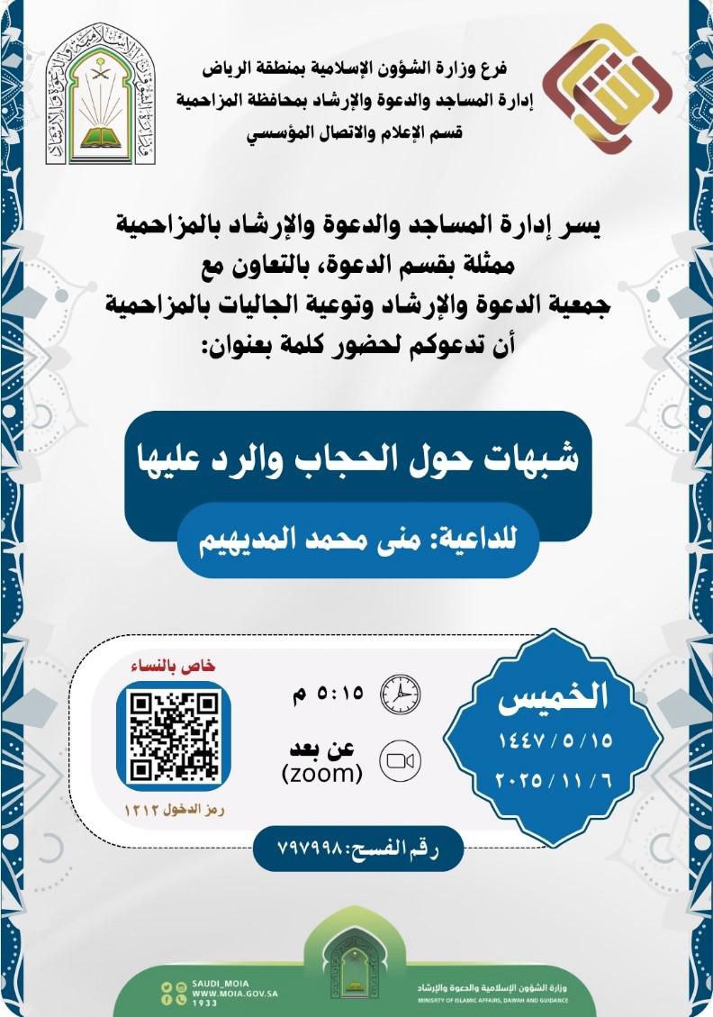 نفذ فرع وزارة الشؤون الإسلامية والدعوة والإرشاد بمنطقة الرياض، ممثلاً بقسم الدعوة بإدارة المساجد والدعوة والإرشاد يوم الخميس الخامس عشر من شهر جمادى الأولى ١٤٤٧هـ، بمحافظة المزاحمية كلمة دعوية مخصصة للنساء