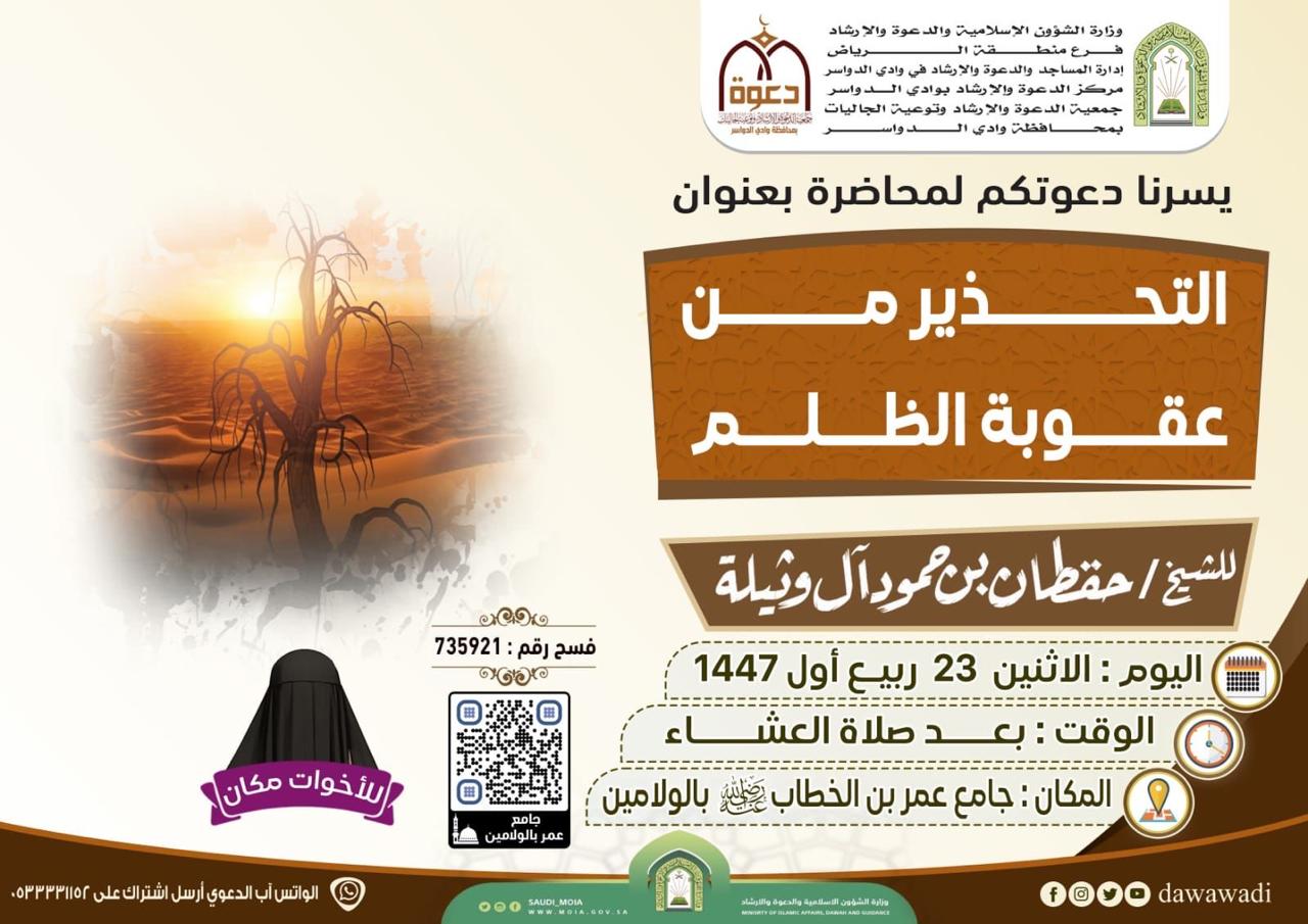 محاضرات دعوية بوادي الدواسر خلال الأسبوع الجاري لتعزيز القيم الإيمانيةنظم فرع وزارة الشؤون الإسلامية والدعوة والإرشاد بمنطقة الرياض، ممثلًا بإدارة المساجد والدعوة والإرشاد بمحافظة وادي الدواسر، بالتعاون مع جمعية الدعوة والإرشاد وتوعية الجاليات، سلسلة من المحاضرات 24/ربيع الأول/1447 التفاصيل