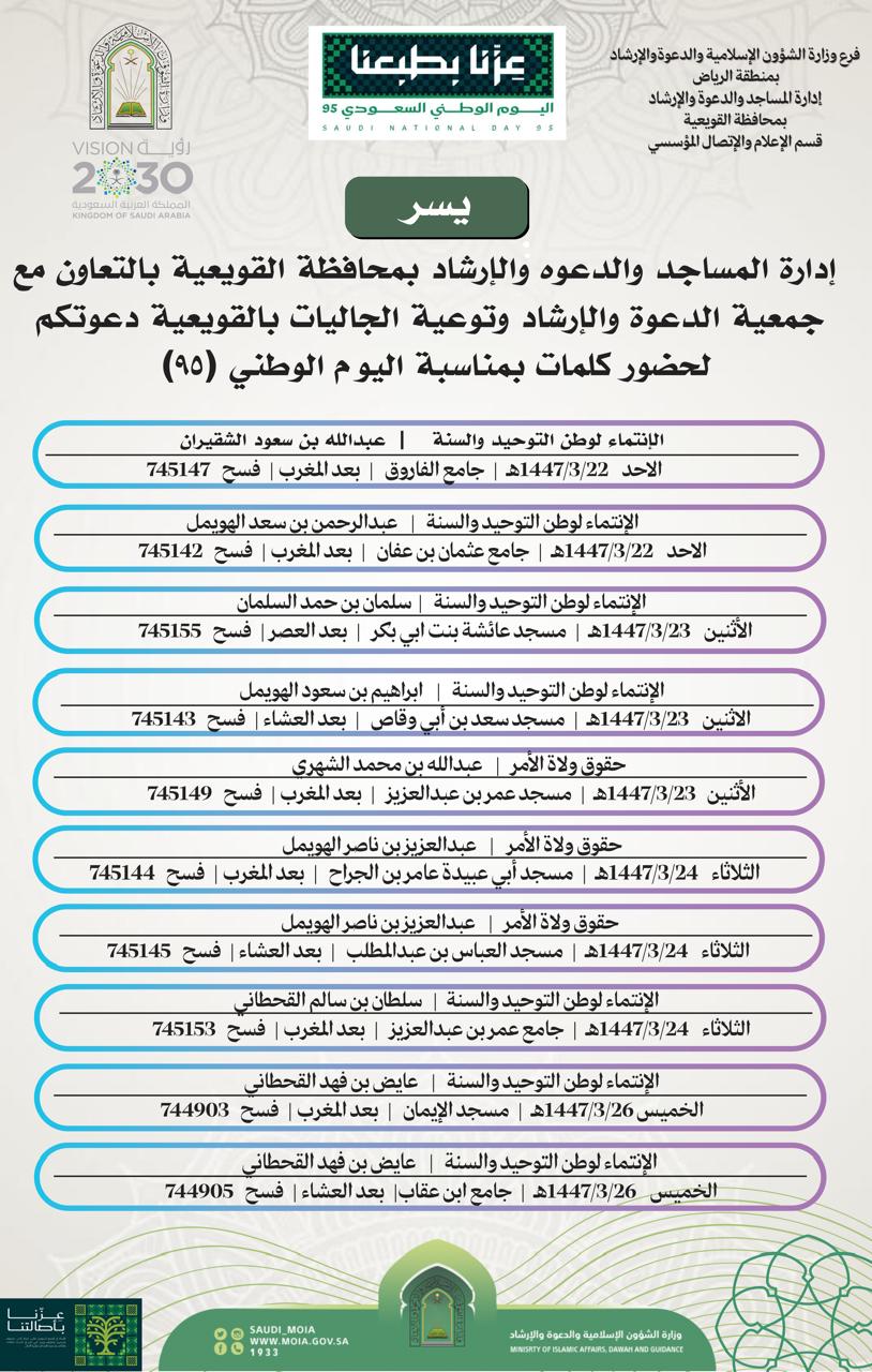 الشؤون الإسلامية بالرياض تنظم كلمات دعوية بالقويعيةينظم فرع وزارة الشؤون الإسلامية والدعوة والإرشاد بمنطقة الرياض، ممثلاً بإدارة المساجد والدعوة والإرشاد بمحافظة القويعية، وبالتعاون مع جمعية الدعوة والإرشاد وتوعية الجاليات بالمحافظة، سلسلة من الكلمات 22/ربيع الأول/1447 التفاصيل
