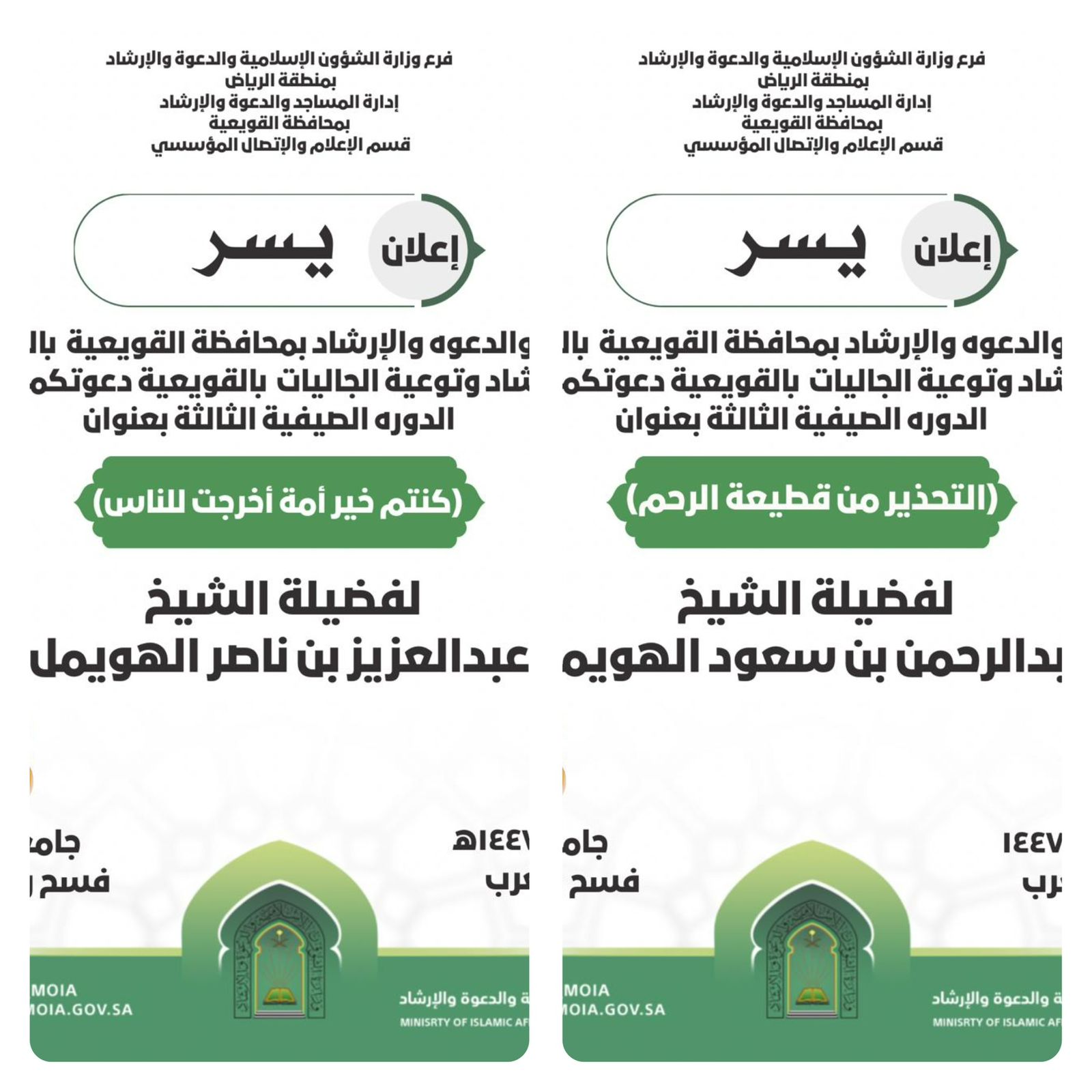 الشؤون الإسلامية بالرياض تواصل تنفيذ الدورة الصيفية الثالثة بالقويعيةيواصل فرع وزارة الشؤون الإسلامية والدعوة والإرشاد بمنطقة الرياض، ممثلاً بإدارة الدعوة والإرشاد بمحافظة القويعية، وبالتعاون مع جمعية الدعوة والإرشاد وتوعية الجاليات بالمحافظة، تنفيذ الدورة الصيفية الثالثة 22/ربيع الأول/1447 التفاصيل