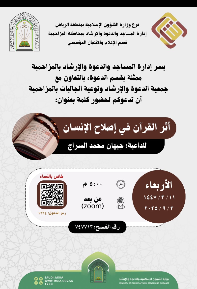 فرع الشؤون الإسلامية بالرياض يقيم محاضرة نسائية عن بُعد بمحافظة المزاحميةأقام فرع وزارة الشؤون الإسلامية والدعوة والإرشاد بمنطقة الرياض، ممثلاً بإدارة المساجد والدعوة والإرشاد بمحافظة المزاحمية، يوم الأربعاء الرابع من ربيع الأول 1447هـ، محاضرة دعوية نسائية بعنوان: “أثر 15/ربيع الأول/1447 التفاصيل