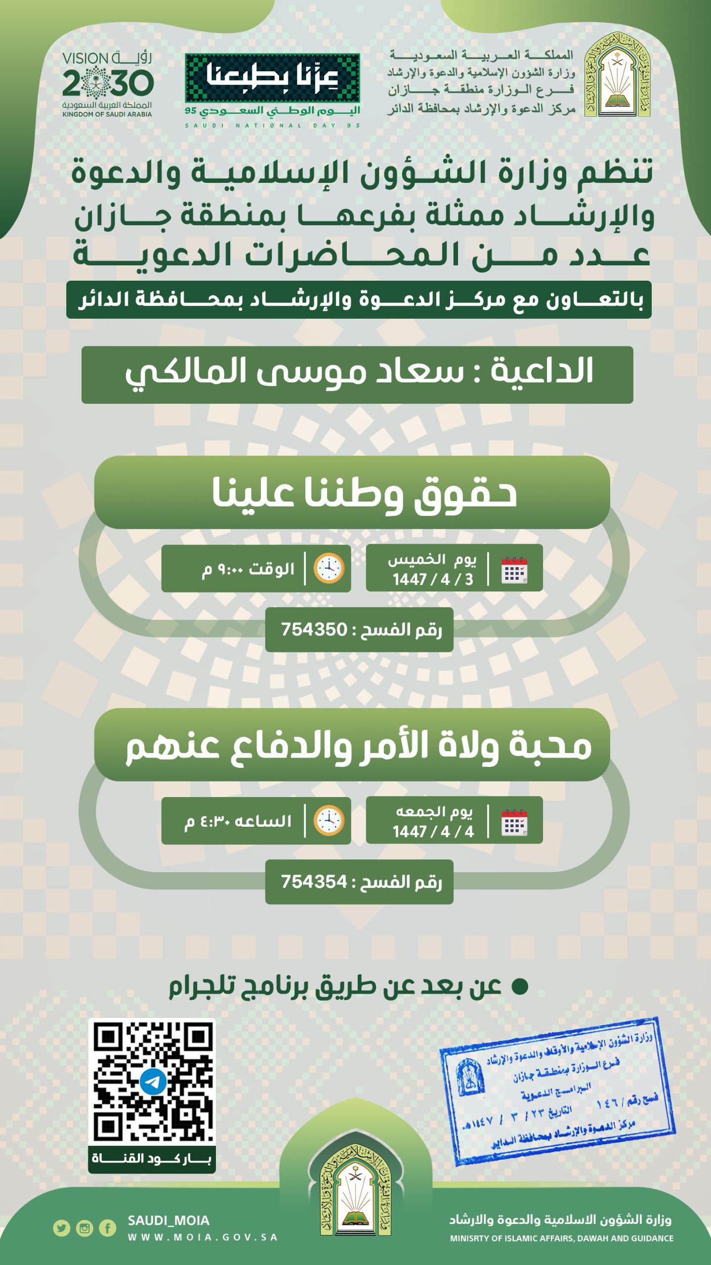 الشؤون الإسلامية في جازان تنظم عدد من المحاضرات الدعوية تزامناً مع اليوم الوطني في ثلاث مُحافظات بالمنطقةMOIA30/ربيع الأول/1447MOIAالإدارة العامة للإعلام والإتصال المؤسسي ينظم فرع وزارة الشؤون الإسلامية والدعوة والإرشاد بمنطقة جازان ممثلاً بإدارات مساجد العيدابي وهروب ومركزة دعوة الدائر خلال الفترة من 2 - 7 / 4 / 1447 للهجرة عدد من المحاضرات الدعوية بالتزامن مع اليوم الوطني السعودي " 95 " تُقام حضورياً في جامع أبوبكر الصديق وجامع أبوعبيدة الجراح بمحافظة العيدابي وتتحدث عن " جهود المملكة في نصرة العقيدة وأهلها " . وعبر الاتصال المرئي بمحافظات هروب والدائر وتتناول مواضيع " حقوق وطننا علينا " و " محبة ولاة الأمر والدفاع عنهم " و " التذكير بأهمية الأمن " و " جهود المملكة في نصرة العقيدة " . تأتي المحاضرات ضمن برامج اليوم الوطني لفرع الوزارة بالمنطقة بهدف تعزيز قيم اللُّحمة الوطنية والفخر بالماضي العريق والحاضر التليد لوطن التوحيد المملكة العربية السعودية .