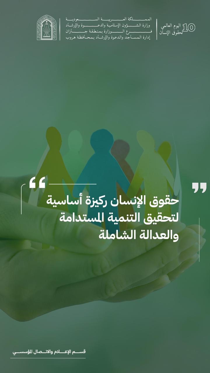 الشؤون الإسلامية ممثلة بفرعها في منطقة جازان تشارك في اليوم العالمي لحقوق الإنسانMOIA20/جمادى الثانية/1447MOIAالإدارة العامة للإعلام والإتصال المؤسسي تُشارك وزارةُ الشؤون الإسلامية والدعوة والإرشاد، ممثّلةً بفرعها في منطقة جازان، اليوم الخميس العشرين من شهر جمادى الآخرة لعام 1447هـ، في فعاليات اليوم العالمي لحقوق الإنسان، وذلك عبر بث مجموعة من المنشورات التوعوية والتثقيفية التي تسلّط الضوء على حقوق الإنسان، وتستمر هذه المشاركة لمدة خمسة أيام، تزامنًا مع هذا اليوم العالمي الذي يصادف العاشر من ديسمبر من كل عام ميلادي. وتتضمن المواد المنشورة - منشورات ومقاطع فيديو - والتي تُعرض عبر الشاشات التفاعلية ووسائل التقنية الحديثة، إبرازَ عناية الإسلام بالإنسان وصون حقوقه، والحثّ على احترامه وعدم المساس بكرامته مهما كانت صفته. كما تُبرز هذه المواد جهودَ المملكة العربية السعودية في حماية حقوق الإنسان ونبذ كل ما يؤذيه أو يسيء إليه. وتأتي مشاركة الفرع في هذا اليوم العالمي تأكيدًا لدور الوزارة في تعزيز الوعي المجتمعي بمنهج الإسلام الحنيف في التعامل مع القضايا الإنسانية، وترسيخ المبادئ والقيم التي تؤكد مكانة الإنسان وحقوقه في الشريعة الإسلامية.