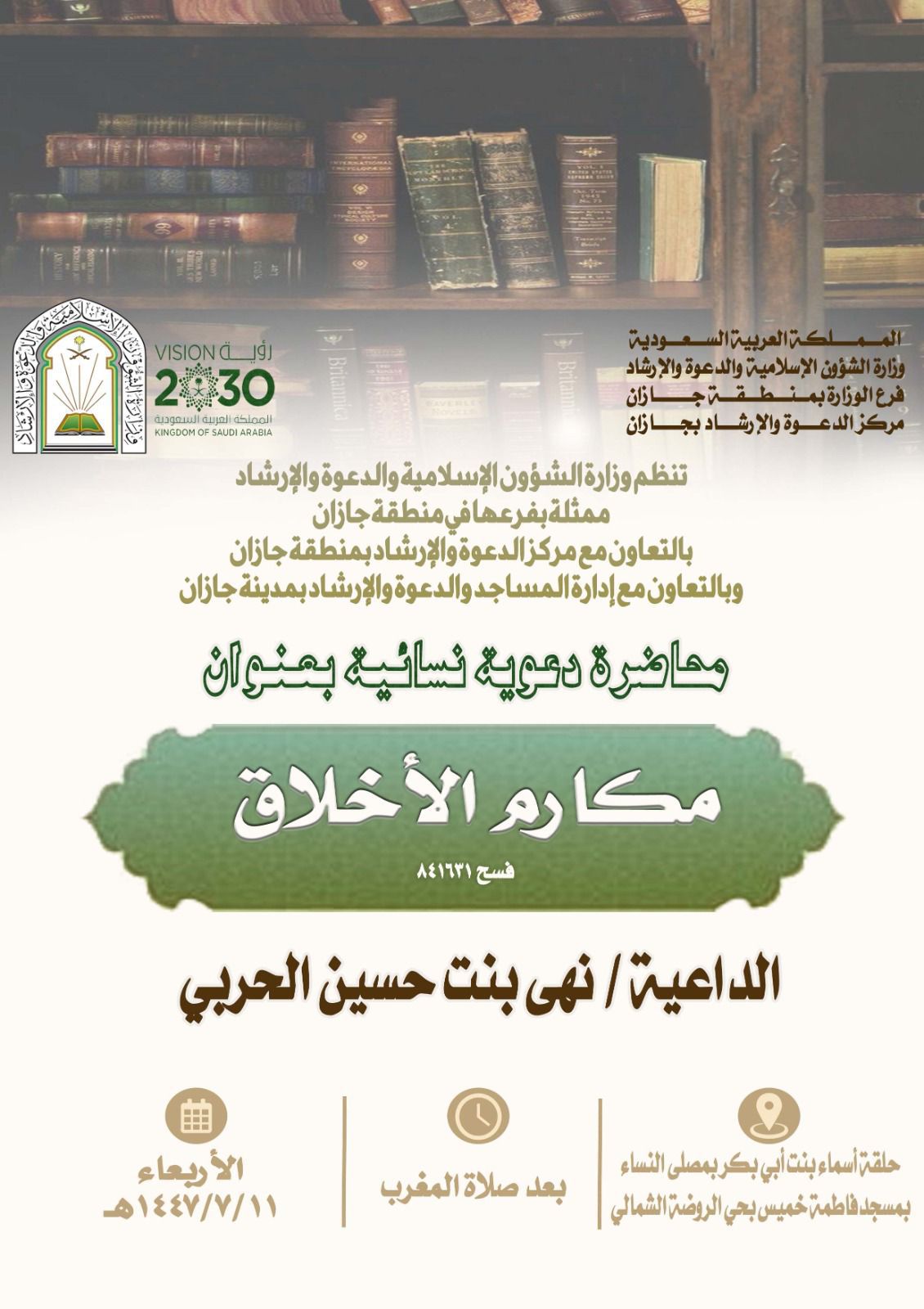 سلسلةٌ من المناشط الدعوية النسائية تُنظّمها الشؤون الإسلامية بجازان في عددٍ من محافظات المنطقةMOIA09/رجب/1447MOIAالإدارة العامة للإعلام والإتصال المؤسسيتُنظّم وزارةُ الشؤون الإسلامية والدعوة والإرشاد، ممثّلةً بفرعها في منطقة جازان، سلسلةً من المناشط الدعوية النسائية، وذلك خلال يومي الثلاثاء والأربعاء 10–11 من شهر رجب لعام 1447هـ، ضمن برامجها الهادفة إلى نشر الوعي الشرعي وتعزيز القيم الإسلامية. ففي محافظة العارضة، يقيم مركز الدعوة عددًا من المناشط الدعوية عبر الاتصال المرئي، تتناول خلالها الداعيات موضوعات: البدعة وأنواعها وأحكامها، ومسؤولية الآباء تجاه الأبناء، وفوائد غضّ البصر، وشهر رجب والبدع. وفي محافظة أبو عريش، ينظّم قسم شؤون الدعوة التابع لإدارة المساجد محاضرةً دعوية عبر الاتصال المرئي، تتناول موضوع التحذير من البدع. أما في مدينة جيزان، فيقيم مركز الدعوة بالتعاون مع إدارة المساجد محاضرةً دعوية حضورياً في المصلى النسائي بمسجد فاطمة خميس بحي الروضة الشمالية، تتناول خلالها الداعية موضوع مكارم الأخلاق. وتهدف هذه المناشط إلى تبصير النساء بأمور دينهن، وترسيخ مفاهيم العقيدة الصحيحة، ورفع مستوى الوعي بالمسائل الشرعية، بما يسهم في حماية المجتمع من الانحرافات الفكرية وترسيخ المنهج الوسطي المعتدل.