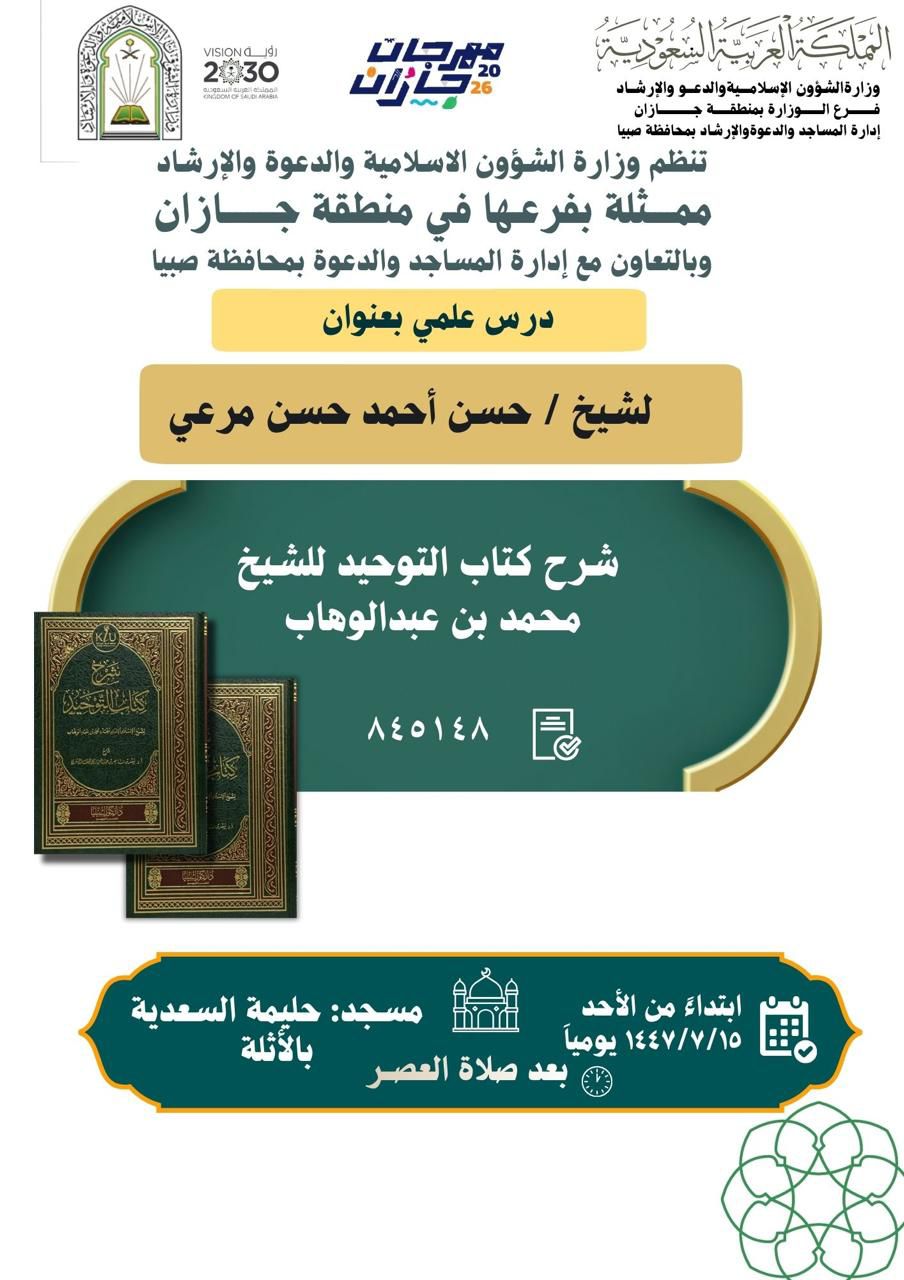 الشؤون الإسلامية بجازان تُنظّم مناشط دعوية في محافظات ضمد وصبيا وبيش تزامنًا مع مهرجان جازانMOIA10/رجب/1447MOIAالإدارة العامة للإعلام والإتصال المؤسسي تُنظّم وزارةُ الشؤون الإسلامية والدعوة والإرشاد، ممثّلةً بفرعها بمنطقة جازان، إدارات المساجد في محافظات ضمد وصبيا وبيش، وبالتعاون مع جمعية الدعوة والإرشاد وتوعية الجاليات بمركزي مسلية والمطعن، سلسلةً من المناشط الدعوية الهادفة، تزامنًا مع فعاليات مهرجان جازان 2026م. وتنطلق هذه المناشط مساء اليوم الثلاثاء الموافق العاشر من شهر رجب لعام 1447هـ من محافظة ضمد، من خلال درسٍ أسبوعي بعنوان "شرح كتاب آداب المشي إلى الصلاة" للشيخ محمد بن عبدالوهاب – رحمه الله –، وذلك بعد صلاة المغرب مباشرةً في مسجد موسى أبو الخير معافا. وتتواصل المناشط يوم غدٍ الأربعاء الحادي عشر من الشهر نفسه بقرية مسلية التابعة لمحافظة بيش، بإقامة كلمةٍ دعوية بعنوان "فضل المسارعة إلى الخيرات"، وذلك بعد صلاة العشاء مباشرةً في مسجد السوق. كما يُقام مساء الأحد القادم الخامس عشر من شهر رجب بقرية الأثلة التابعة لمحافظة صبيا، في مسجد حليمة السعدية، درسٌ علمي يتناول "شرح كتاب التوحيد" للشيخ محمد بن عبدالوهاب – رحمه الله –، بعد صلاة العصر مباشرةً. وتأتي هذه المناشط ضمن برامج فرع الوزارة الدعوية خلال شهر رجب، الهادفة إلى نشر العلم الشرعي، وتعزيز الوعي الديني، وترسيخ القيم الإسلامية في المجتمع.