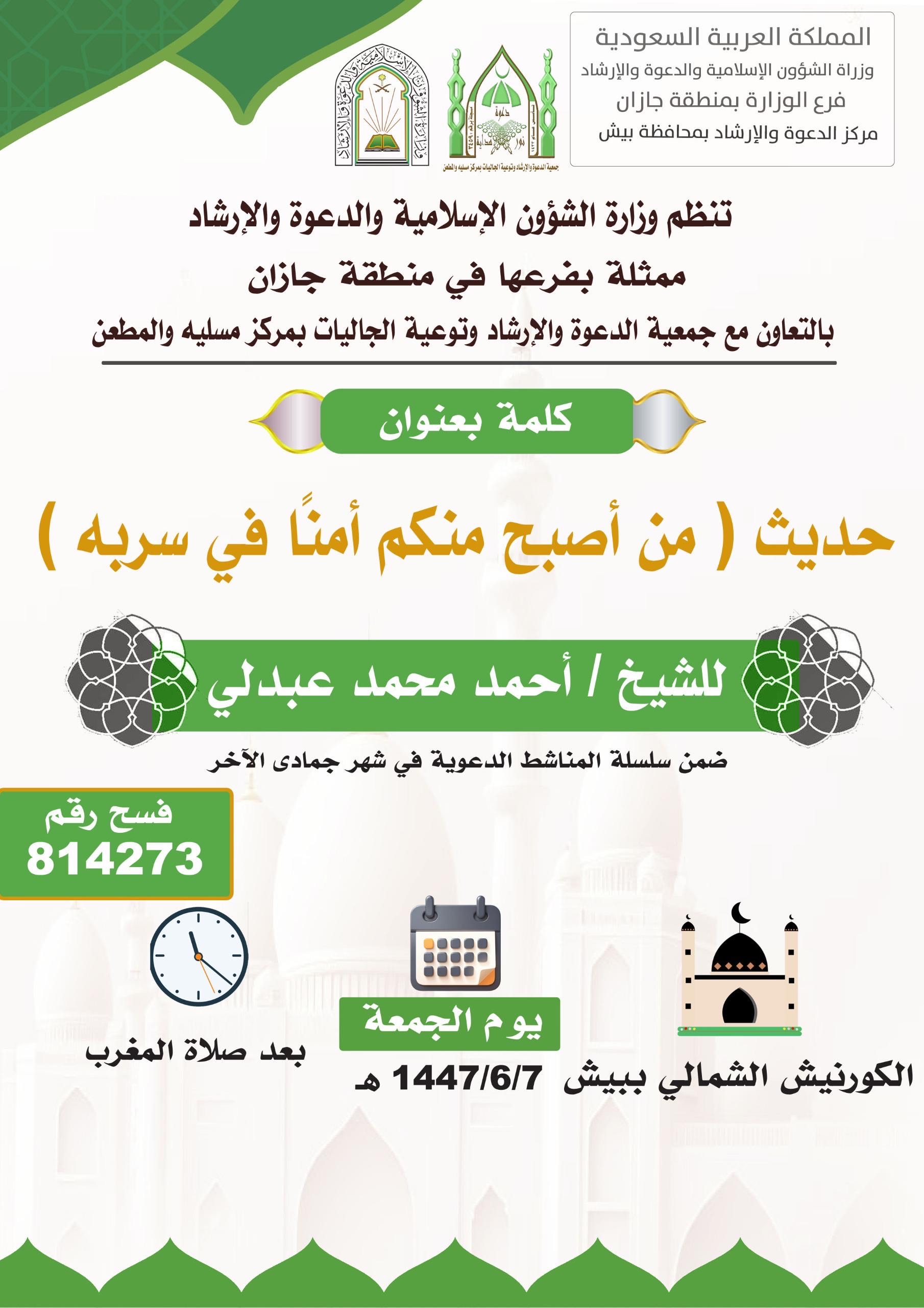 سلسلة كلمات ومحاضرتين دعويتين تُقيمها الشؤون الإسلامية بجازان في محافظتي العارضة والريثيُقيم فرع وزارة الشؤون الإسلامية والدعوة والإرشاد بمنطقة جازان، ممثلاً بإدارة المساجد والدعوة والإرشاد بمحافظة الريث، وبالتعاون مع جمعية الدعوة والإرشاد وتوعية الجاليات بمركز القصبة التابع لمحافظة العارضة، 04/جمادى الثانية/1447 التفاصيل