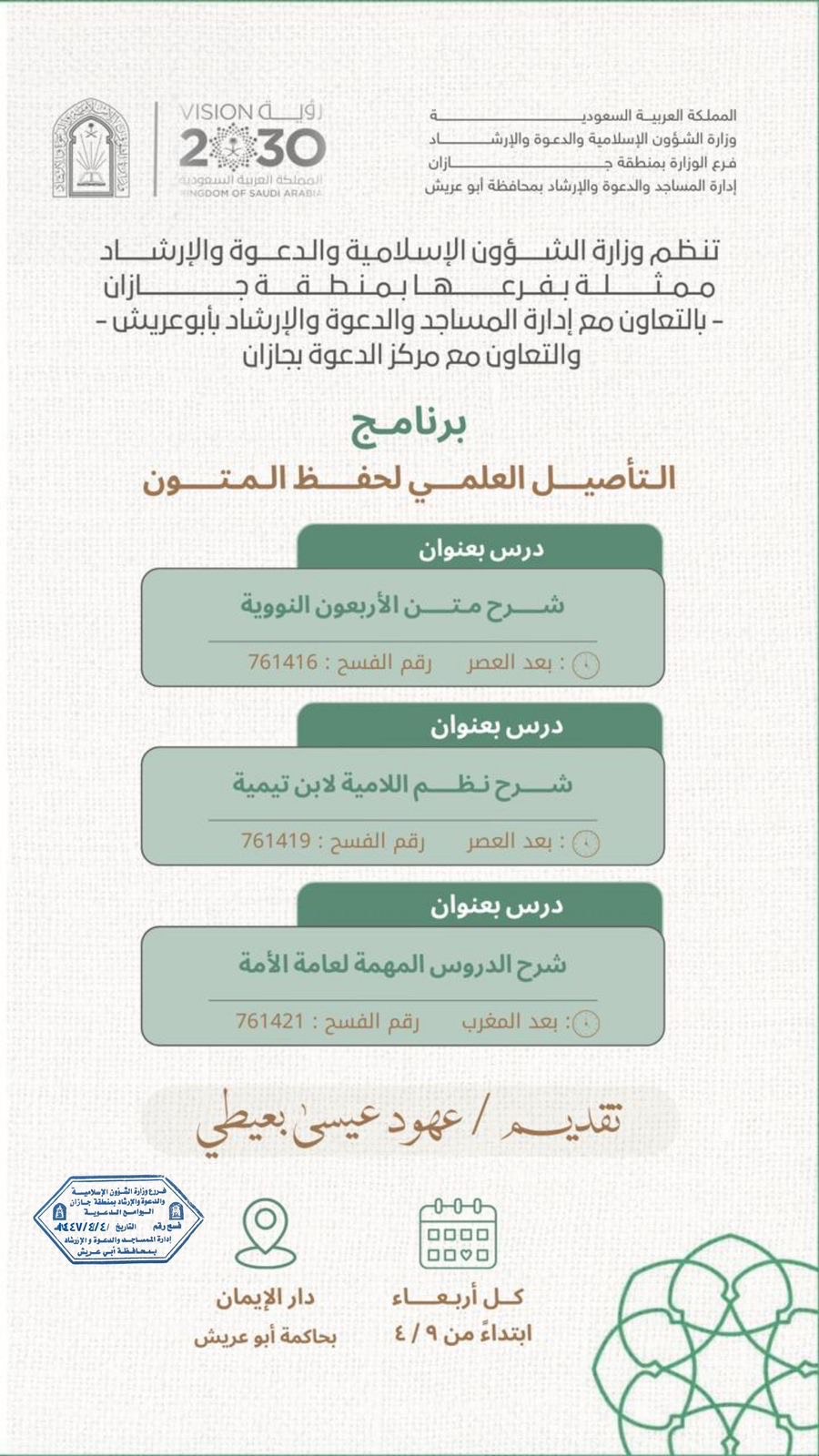 الشؤون الإسلامية بجازان تنفذ برنامج نسائي "التأصيل العلمي لحفظ المتون” في أبو عريش نفذ فرع وزارة الشؤون الإسلامية والدعوة والإرشاد في منطقة جازان، ممثلاً بقسم الدعوة في إدارة مساجد محافظة أبو عريش، برنامجاً دعوياً نسائياً أسبوعياً بعنوان “التأصيل العلمي لحفظ المتون”، وذلك يوم الأربعاء 20/ربيع الثاني/1447 التفاصيل