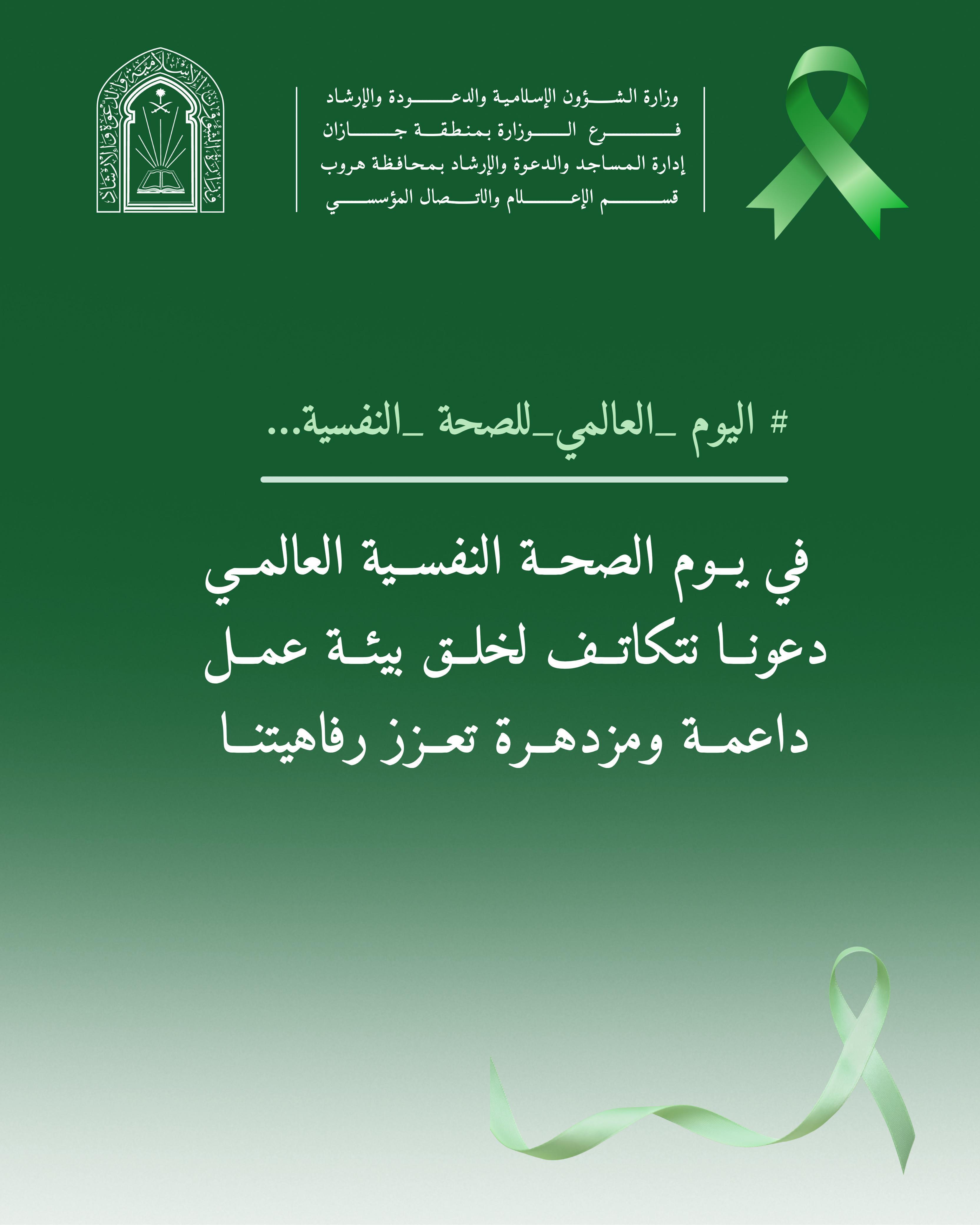 فرع الشؤون الإسلامية بجازان يشارك في اليوم العالمي للصحة النفسيةشارك فرع وزارة الشؤون الإسلامية والدعوة والإرشاد بمنطقة جازان في فعاليات اليوم العالمي للصحة النفسية، من خلال بثّ منشورات ومقاطع فيديو توعوية وتثقيفية عبر الشاشات الرئيسة في مقر الفرع، وإدارات المساجد، 21/ربيع الثاني/1447 التفاصيل