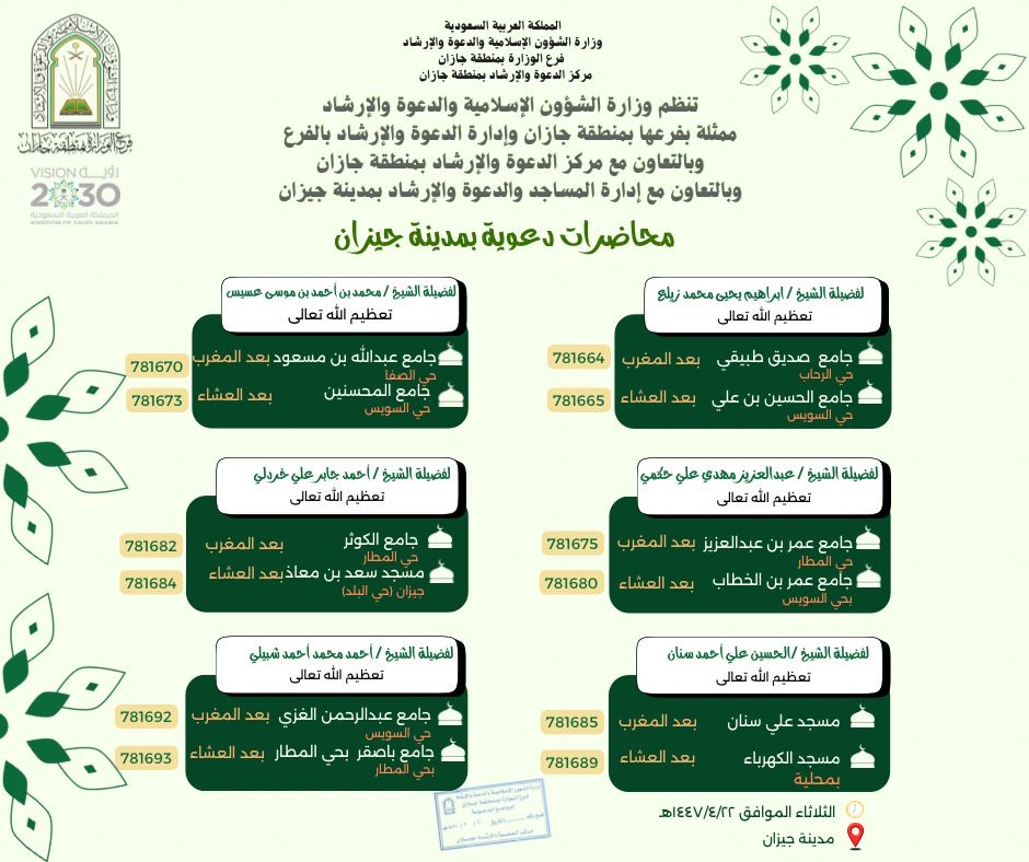 سلسلة من الكلمات الدعوية ينفذها فرع وزارة الشؤون الإسلامية بجازان في جوامع ومساجد مدينة جيزان ينظم فرع وزارة الشؤون الإسلامية والدعوة والإرشاد في منطقة جازان ممثلا بمركز الدعوة بمدينة جيزان مساء اليوم الثلاثاء الثاني والعشرون من شهر ربيع الثاني 1447 هجرية سلسلة من الكلمات الدعوية بمشاركة قسم 22/ربيع الثاني/1447 التفاصيل