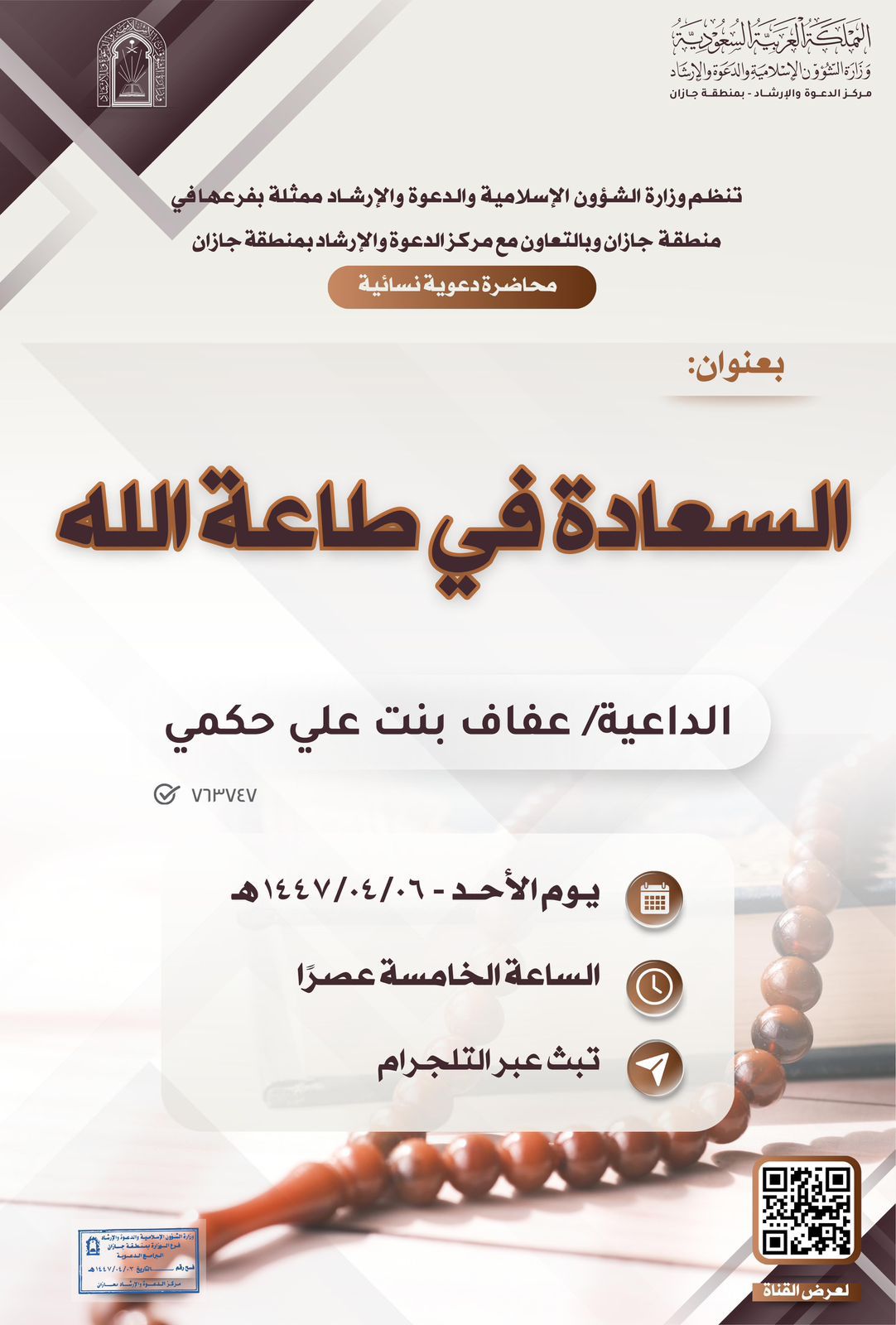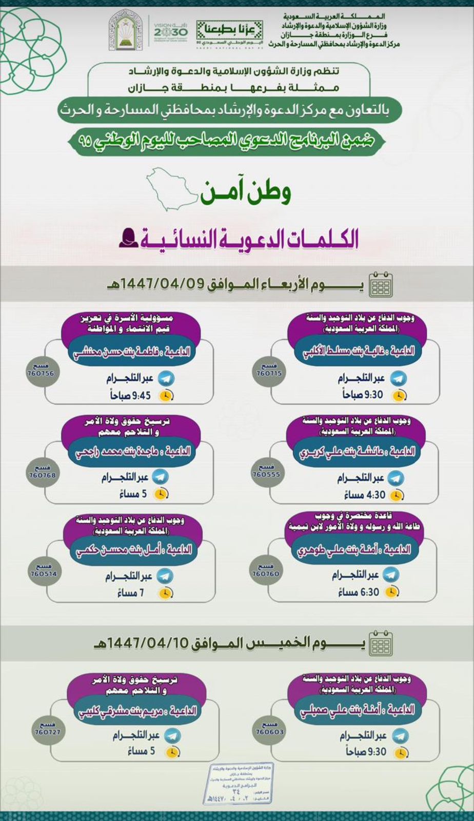 الشؤون الإسلامية في جازان تنظم مناشط دعوية نسائية في جيزان والداير ينظم فرع وزارة الشؤون الإسلامية والدعوة والإرشاد بمنطقة جازان، ممثلاً بمركز الدعوة بمدينة جيزان، مساء اليوم الأحد 6 ربيع الآخر 1447هـ، عدداً من المناشط الدعوية النسائية، وذلك حضورياً في مسجد زيد بن 06/ربيع الثاني/1447 التفاصيل