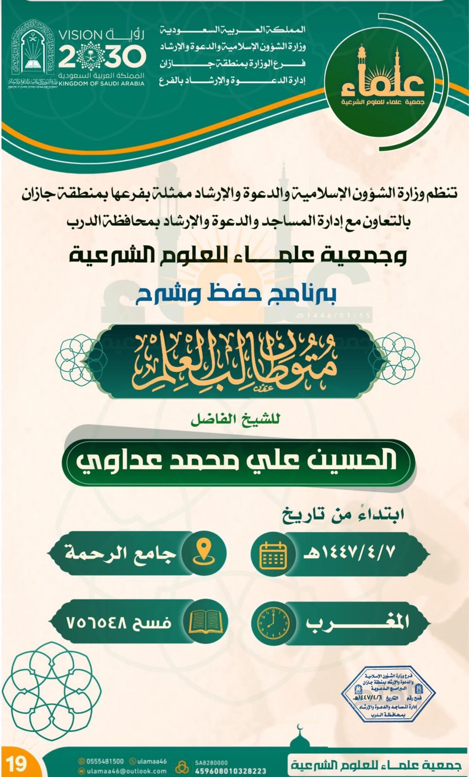 الشؤون الإسلامية في جازان تنفذ برامج تعليمية ودروسًا علمية لتعزيز الوعي الشرعي يواصل فرع وزارة الشؤون الإسلامية والدعوة والإرشاد في منطقة جازان، ممثلًا بقسم الدعوة التابع لإدارة مساجد محافظة الدرب، تنفيذ برامجه التعليمية والتوعوية بالتعاون مع جمعية “علماء” للعلوم الشرعية، حيث 08/ربيع الثاني/1447 التفاصيل