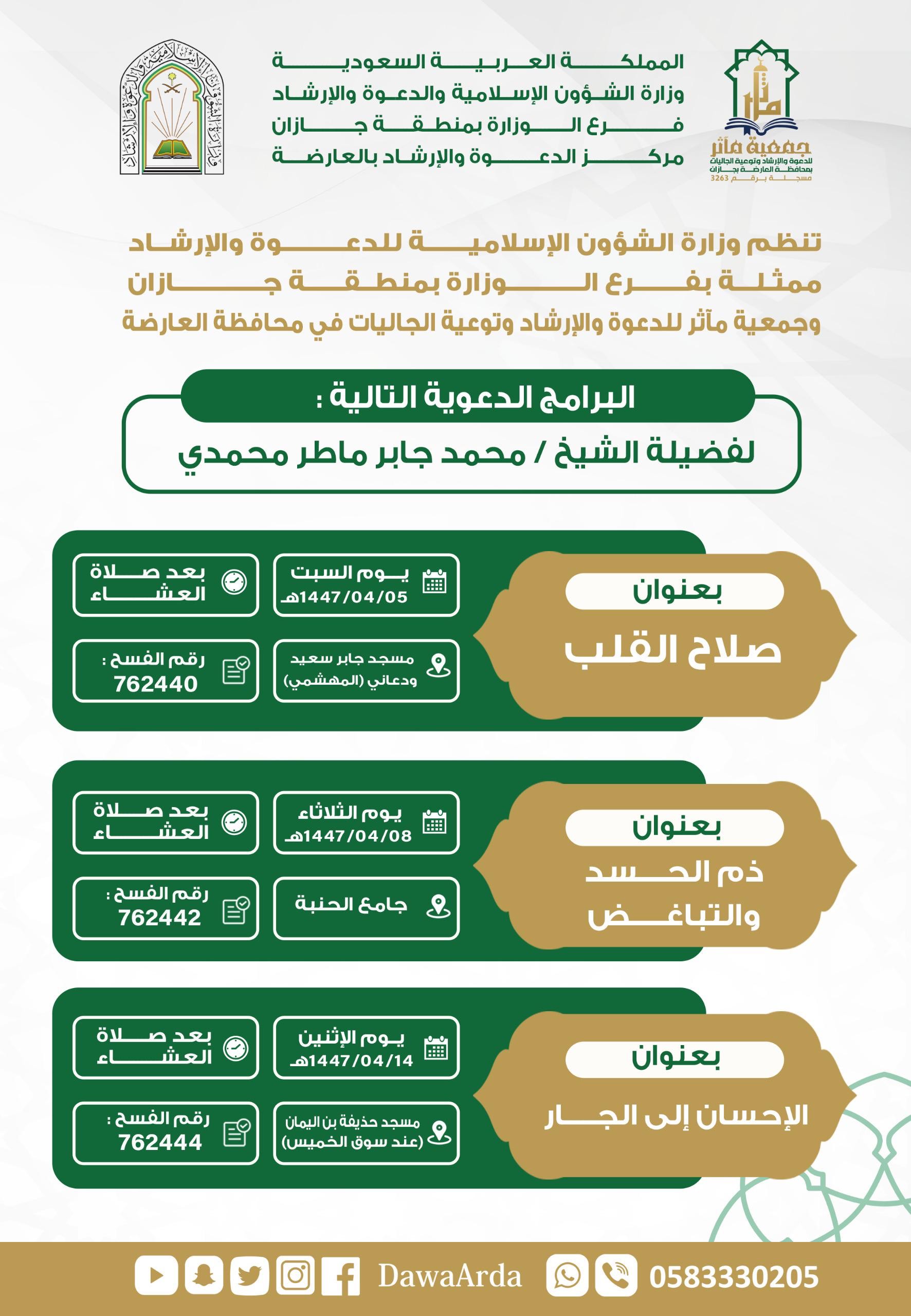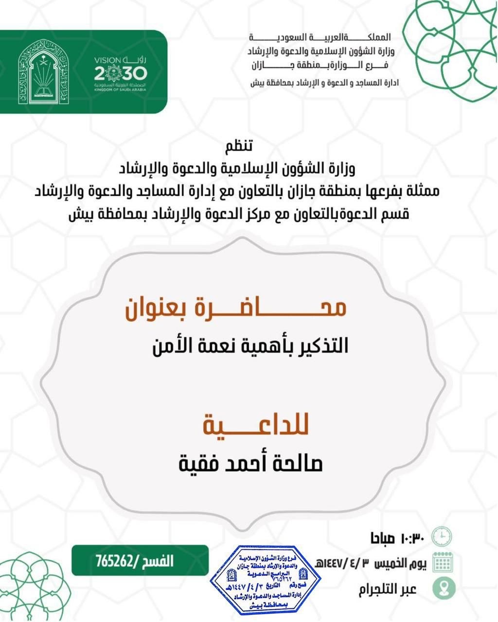 الشؤون الإسلامية بمنطقة جازان تنفذ محاضرات دعوية في محافظة بيش ينفذ فرع وزارة الشؤون الإسلامية والدعوة والإرشاد بمنطقة جازان، ممثلاً بمركز الدعوة بمحافظة بيش، سلسلة من المحاضرات الدعوية ضمن البرنامج الدعوي الشهري، وذلك ابتداءً من اليوم الأربعاء الثاني من شهر ربيع 02/ربيع الثاني/1447 التفاصيل