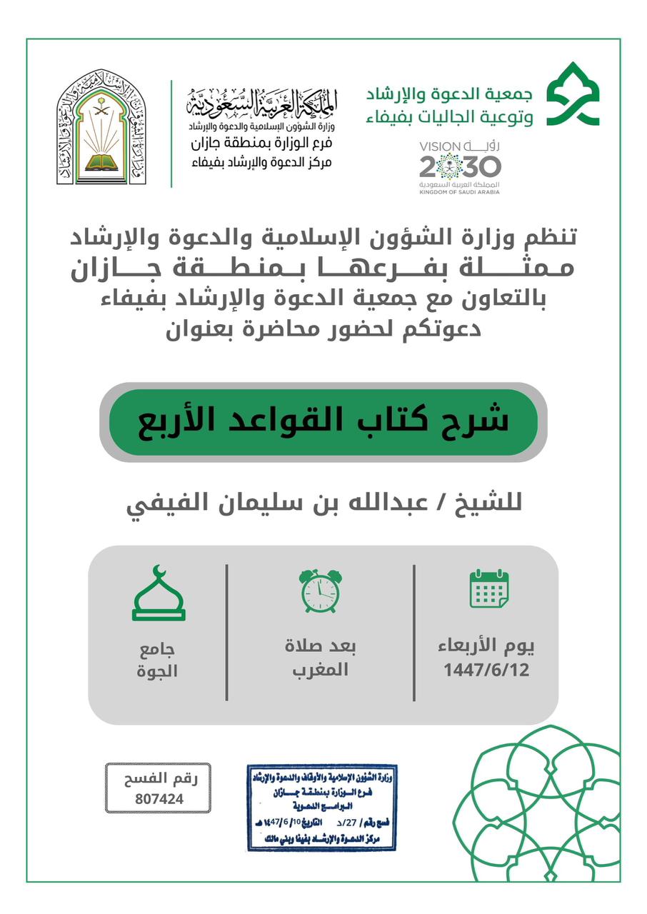 الشؤون الإسلامية في جازان تُواصل تنفيذ مناشطها الدعوية في مدينة جيزان ومحافظة فيفا تواصل وزارةُ الشؤون الإسلامية والدعوة والإرشاد، ممثّلةً بفرعها في منطقة جازان، وبالتعاون مع مركز الدعوة والإرشاد بمدينة جيزان وجمعية الدعوة والإرشاد بمحافظة فيفا، تنفيذ مناشطها الدعوية المتنوعة خلال 11/جمادى الثانية/1447 التفاصيل