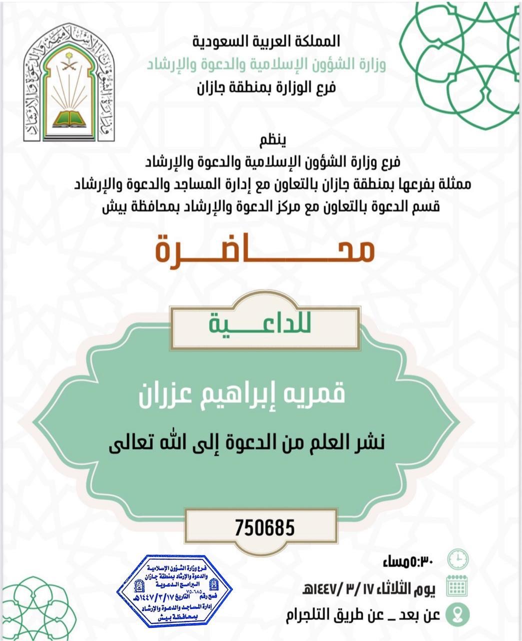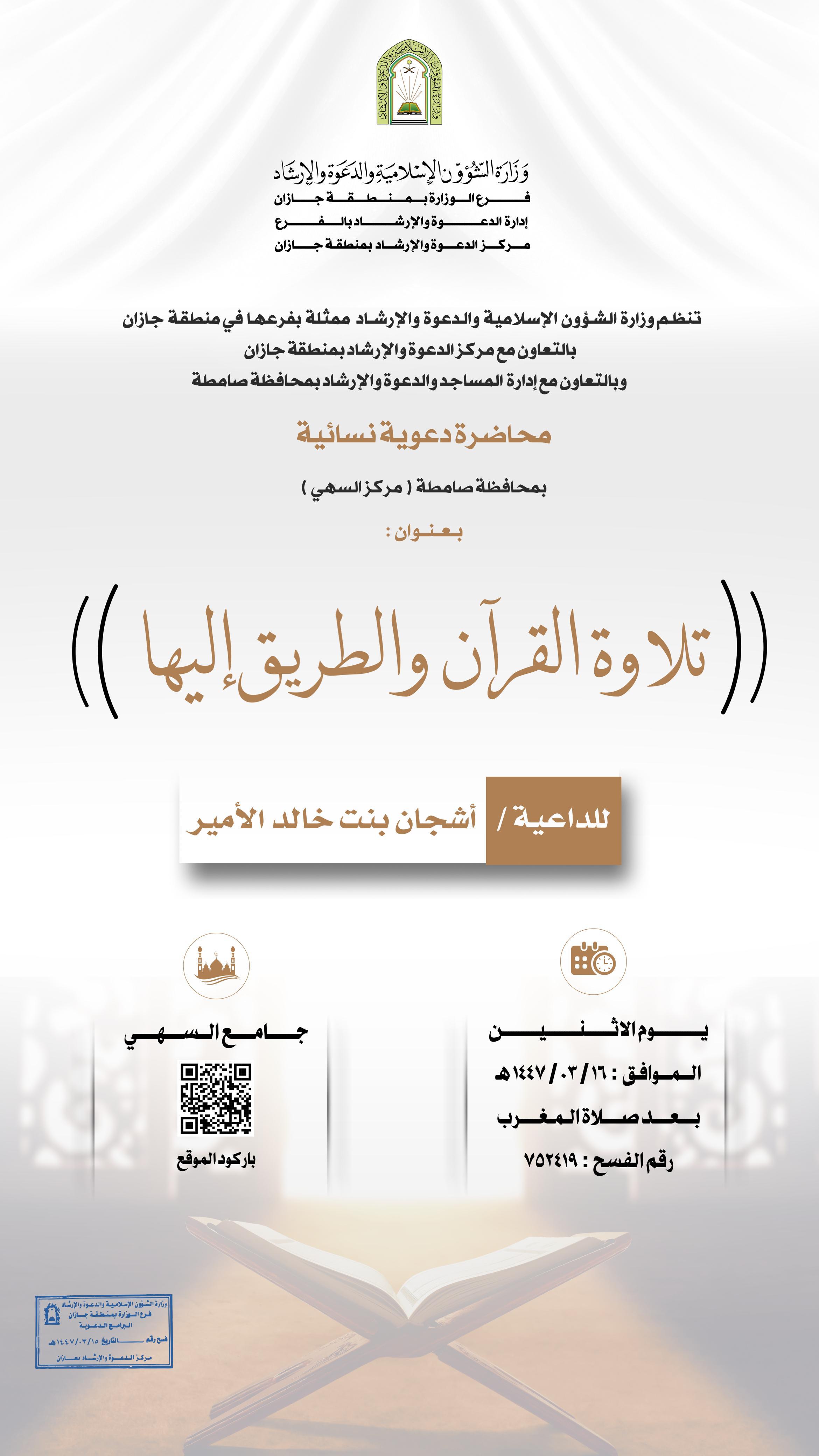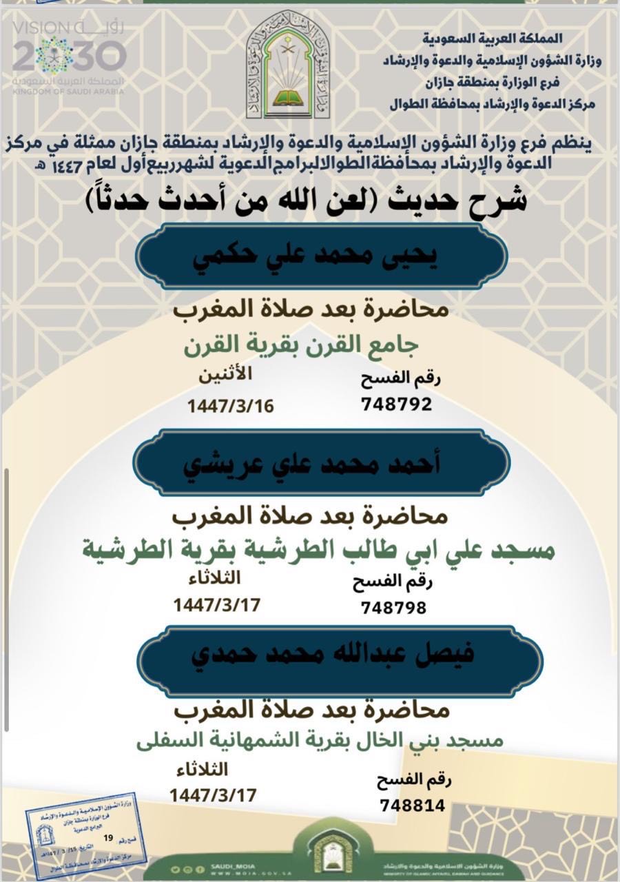 الشؤون الإسلامية بجازان تنفذ محاضرة دعوية نسائيةنفذ فرع وزارة الشؤون الإسلامية والدعوة والإرشاد بمنطقة جازان، ممثلًا بمركز الدعوة بمدينة جيزان وبمشاركة قسم الدعوة التابع لإدارة مساجد صبيا، صباح أمس الأربعاء الحادي عشر من شهر ربيع الأول 1447هـ، محاضرة 12/ربيع الأول/1447 التفاصيل