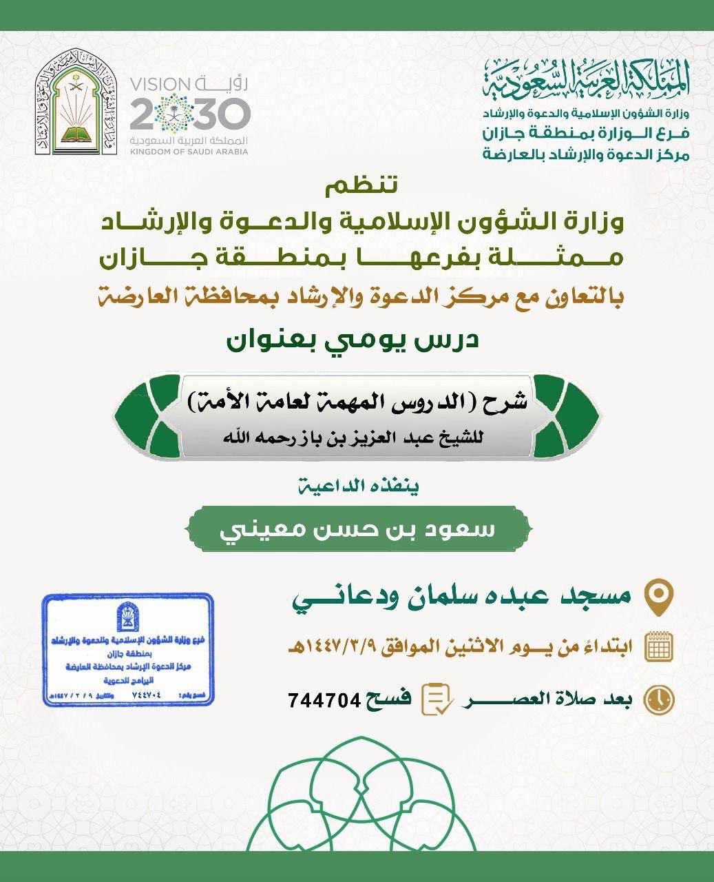 الشؤون الإسلامية في جازان تطلق سلسلة من المناشط الدعوية في محافظة العارضةينفذ فرع وزارة الشؤون الإسلامية والدعوة والإرشاد بمنطقة جازان، ممثلاً بمركز الدعوة بمحافظة العارضة، وبالتعاون مع جمعية نجاة للدعوة والإرشاد وتوعية الجاليات بمركز الحميراء، سلسلة من المناشط الدعوية التي 15/ربيع الأول/1447 التفاصيل