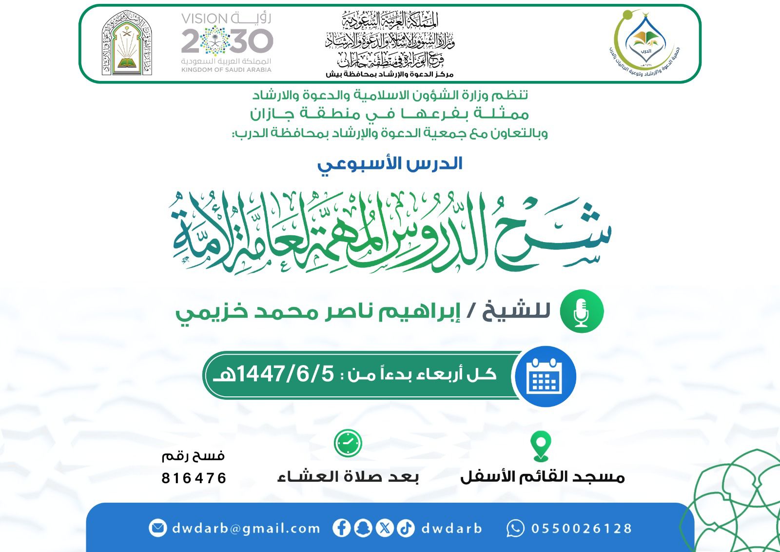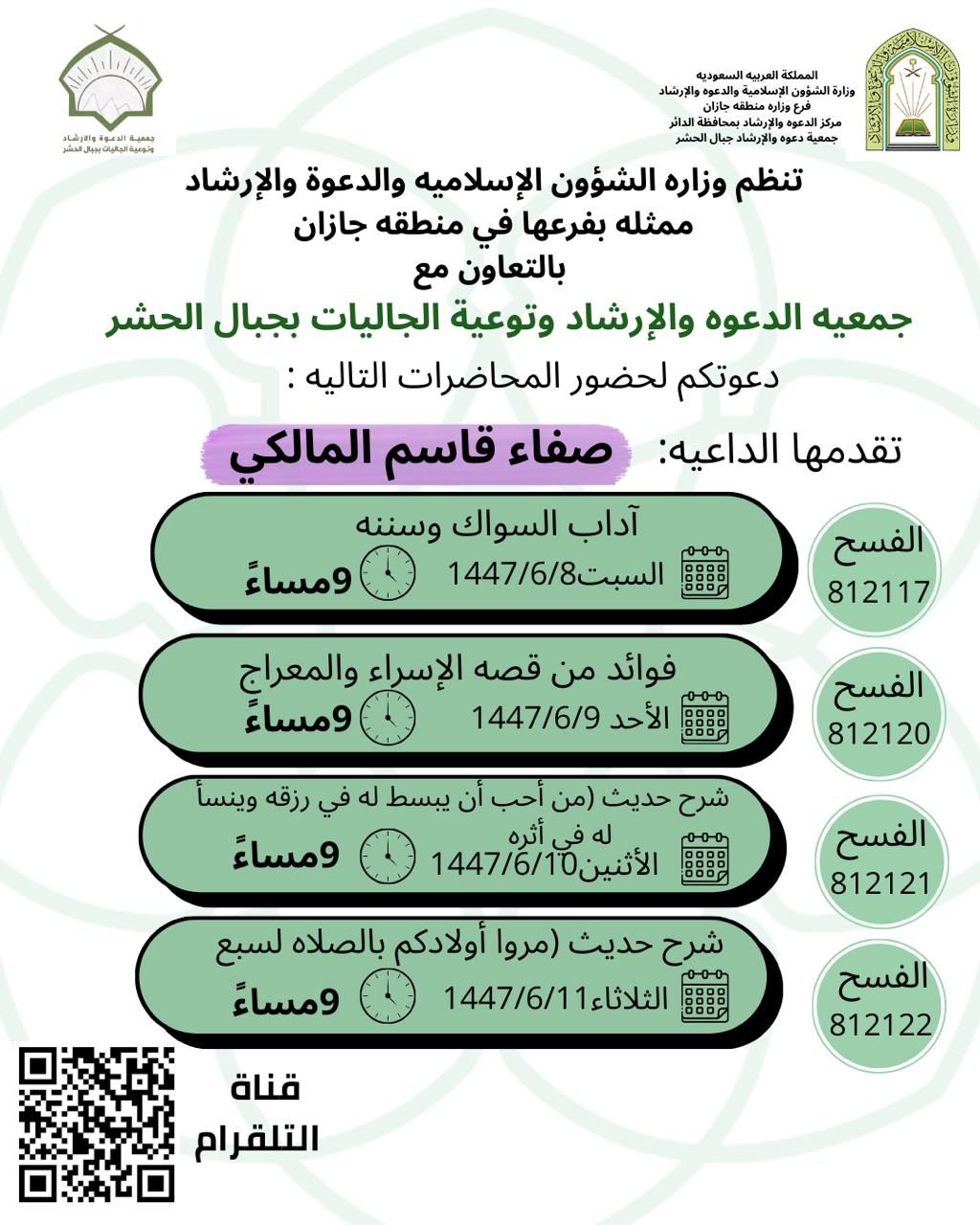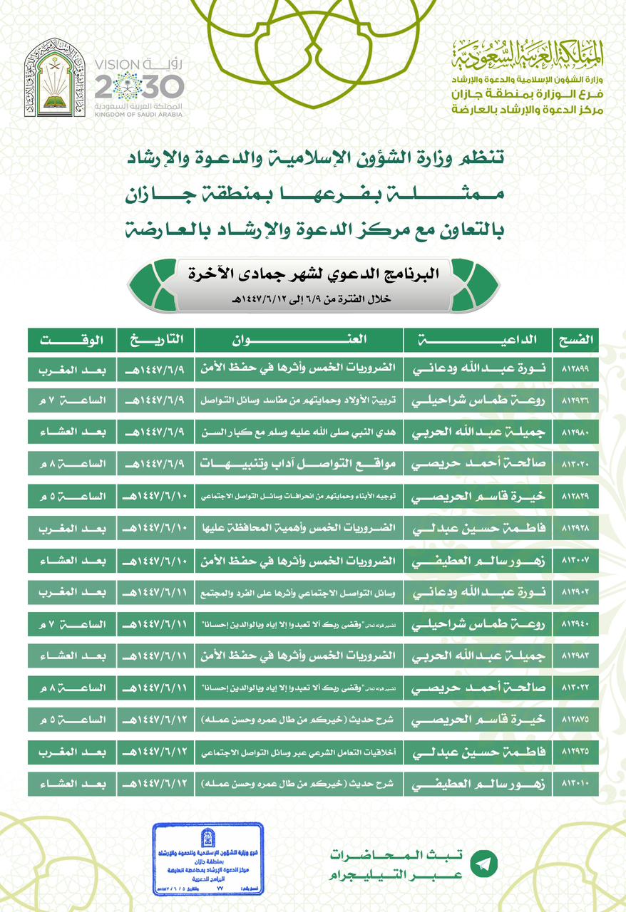 الشؤون الإسلامية في جازان تطلق سلسلة من المناشط الدعوية النسائية بمحافظة العارضةأطلق فرع وزارة الشؤون الإسلامية والدعوة والإرشاد في منطقة جازان ممثلا بمركز دعوة محافظة العارضة سلسلة من الكلمات الدعوية ضمن البرنامج الدعوي لشهر جماد الآخر 1447 هجرية ابتداءاً من اليوم التاسع وتستمر 06/جمادى الثانية/1447 التفاصيل