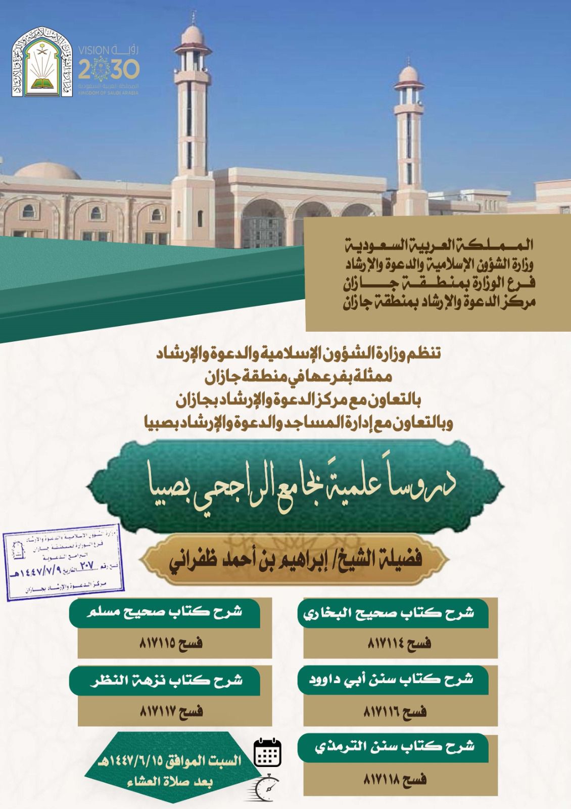 سلسلة مناشط دعوية تنفذها الشؤون الإسلامية بجازان في محافظتي ضمد وصبيا تُنفّذ وزارة الشؤون الإسلامية والدعوة والإرشاد، ممثلةً بفرعها في منطقة جازان، وبالتعاون مع إدارتي المساجد والدعوة والإرشاد في محافظتي ضمد وصبيا، سلسلةً من المناشط الدعوية التي تُقام حضورياً في الجوامع 09/جمادى الثانية/1447 التفاصيل