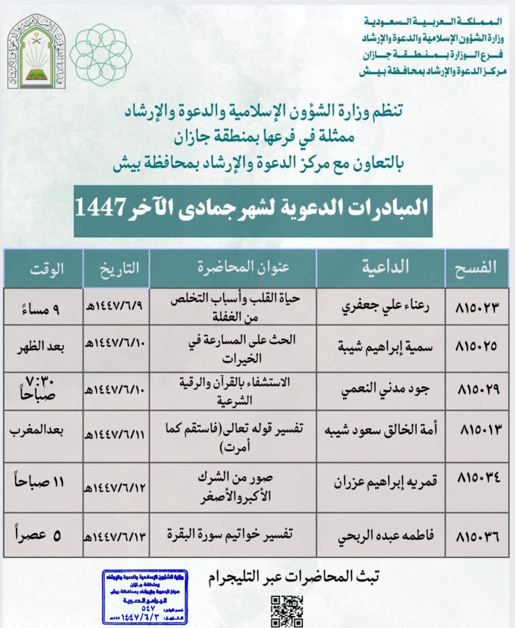 الشؤون الإسلامية بجازان تُنظّم سلسلة مناشط دعوية في محافظة بيش تنظّم وزارةُ الشؤون الإسلامية والدعوة والإرشاد، ممثلةً بفرعها في منطقة جازان، وبالتعاون مع مركز الدعوة والإرشاد بمحافظة بيش، وجمعية الدعوة والإرشاد وتوعية الجاليات بمركزي مسلية والمطعن، سلسلة من المناشط 10/جمادى الثانية/1447 التفاصيل
