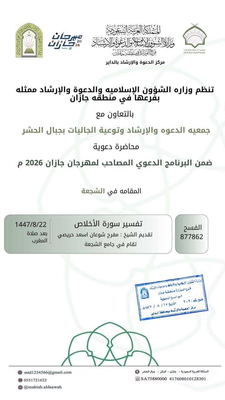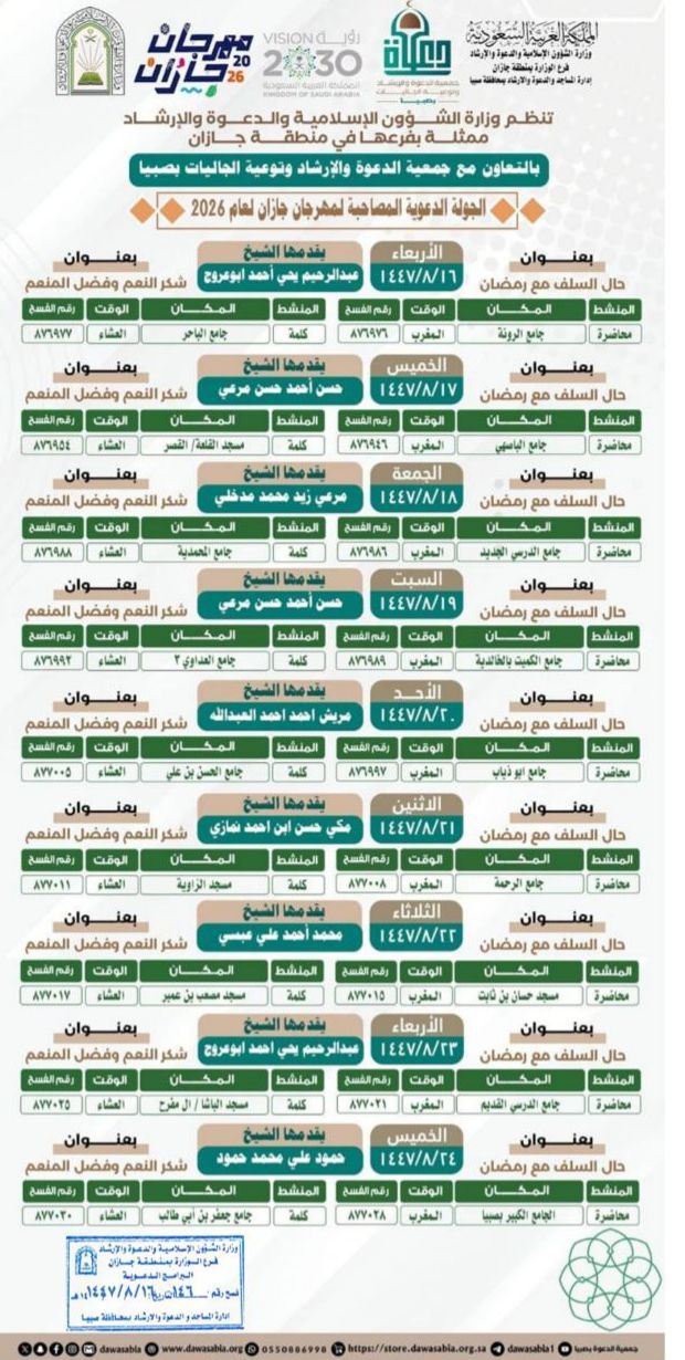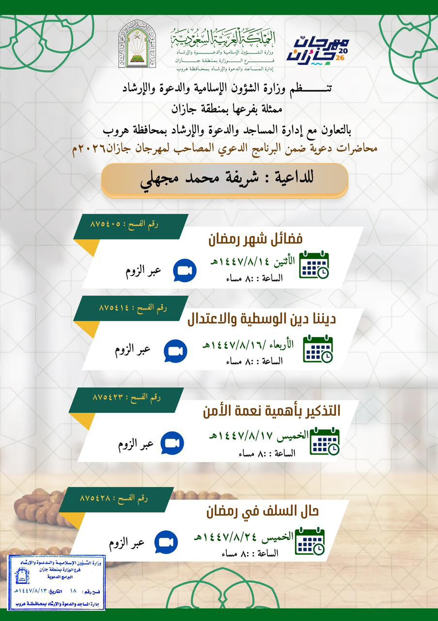 الشؤون الإسلامية بجازان تُنفّذ مناشط دعوية في محافظتي العارضة والعيدابي تُنفّذ وزارةُ الشؤون الإسلامية والدعوة والإرشاد، ممثّلةً بفرعها في منطقة جازان، عددًا من المناشط الدعوية في محافظتي العارضة والعيدابي، وذلك ضمن البرنامج الدعوي المصاحب لمهرجان جازان 2026م، وفي إطار 19/شعبان/1447 التفاصيل