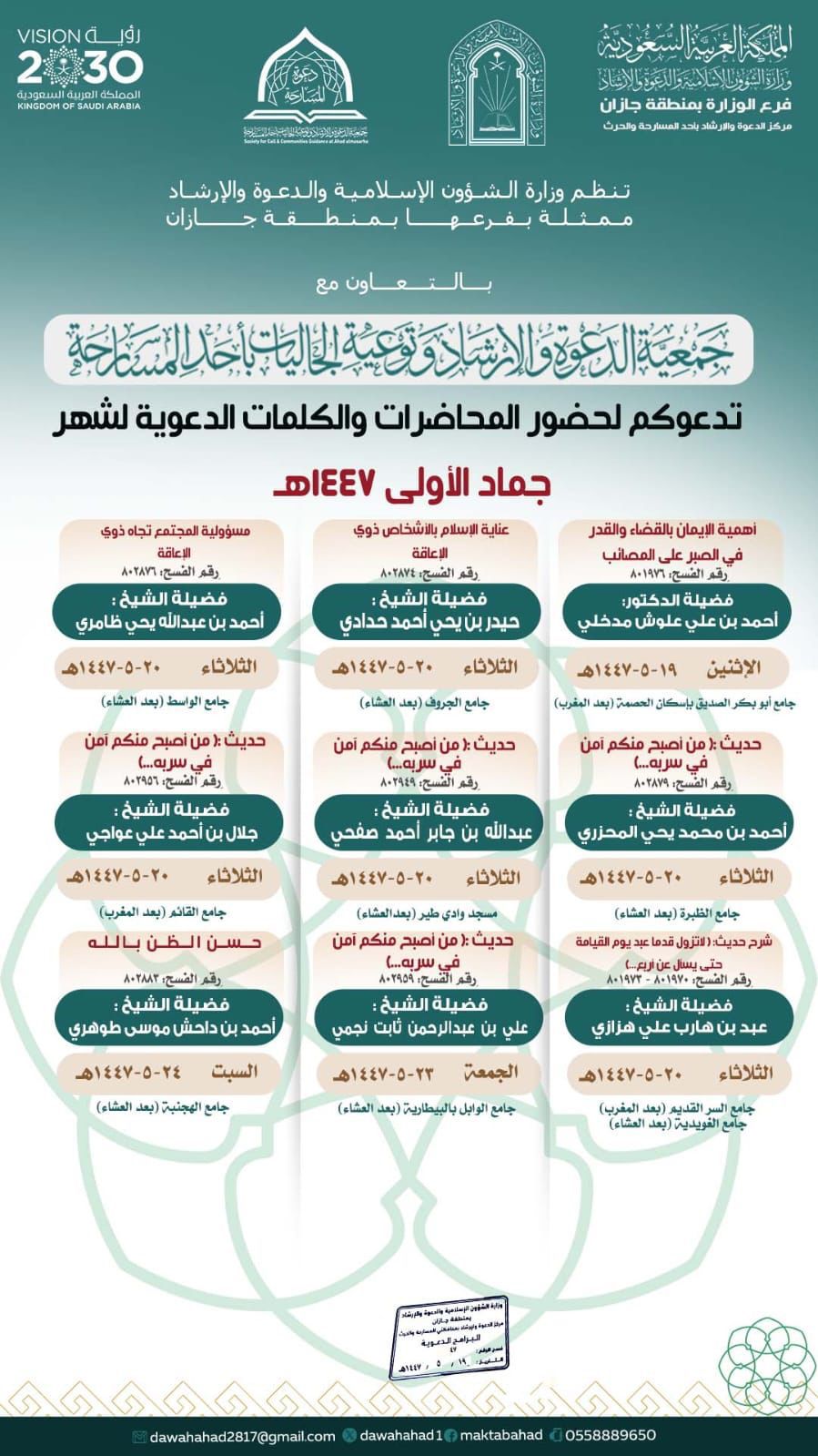 الشؤون الإسلامية بجازان تقيم برنامجًا دعويًا نسائيًا في محافظتي المسارحة والحرثيُقيم فرع وزارة الشؤون الإسلامية والدعوة والإرشاد بمنطقة جازان، ممثلاً بمركز الدعوة والإرشاد بمحافظتي المسارحة والحرث، البرنامج الدعوي النسائي الذي ينطلق مساء اليوم الأحد الخامس والعشرين من شهر جمادى 25/جمادى الأولى/1447 التفاصيل
