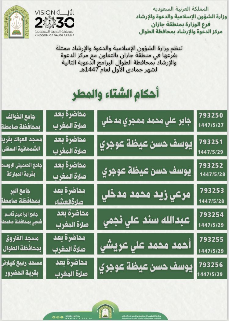 الشؤون الإسلامية في جازان تنفذ مناشط دعوية في الطواليطلق فرع وزارة الشؤون الإسلامية والدعوة والإرشاد بمنطقة جازان، ممثلًا بمركز الدعوة والإرشاد بمحافظة الطوال، سلسلة من المناشط الدعوية ضمن برنامج “أحكام الشتاء”، وذلك ابتداءً من يوم السبت الخامس والعشرين 22/جمادى الأولى/1447 التفاصيل