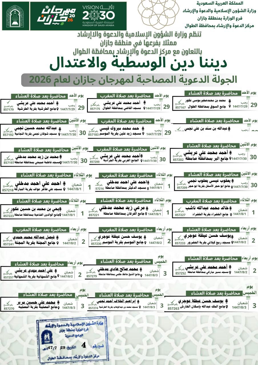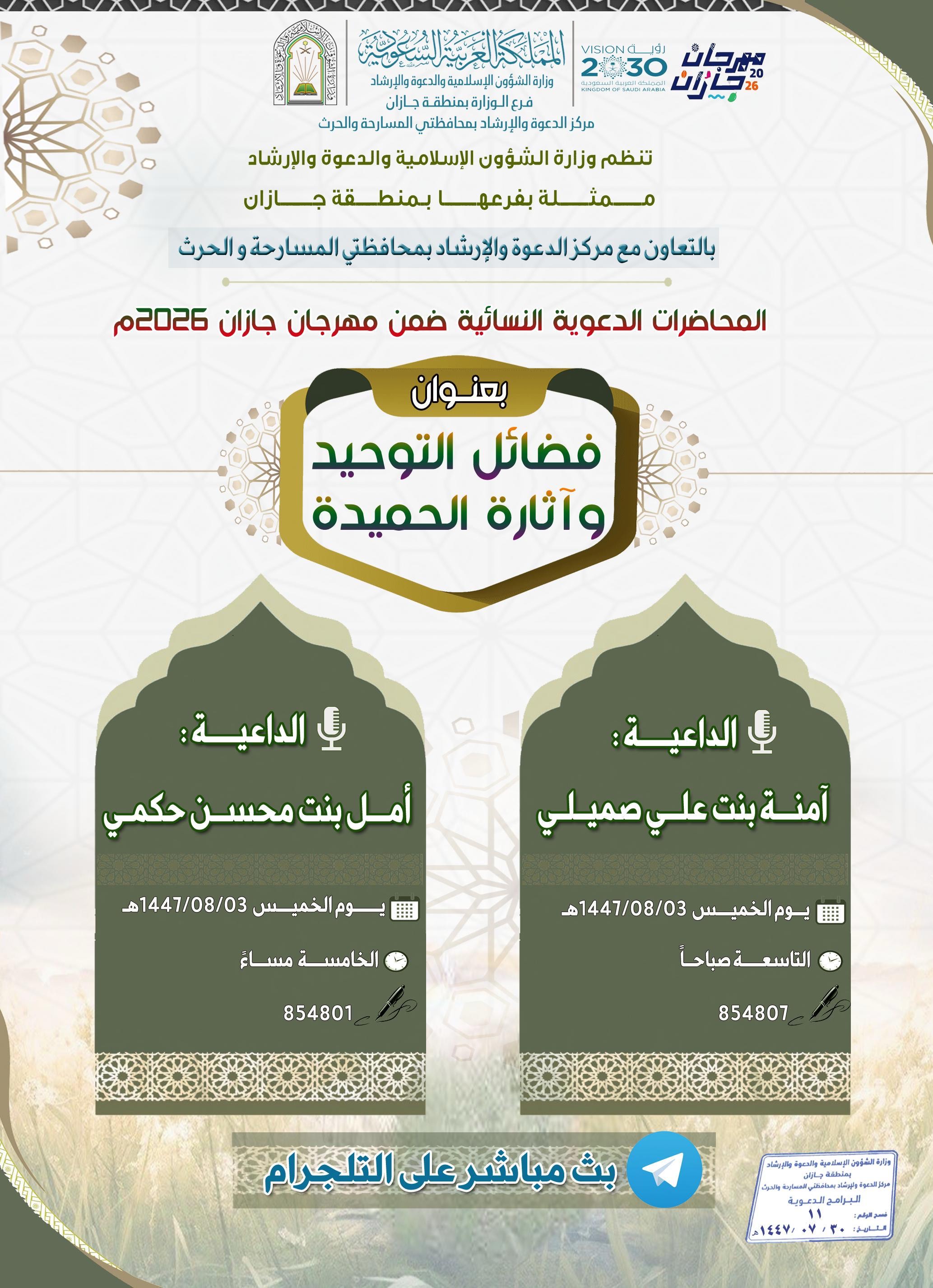 الشؤون الإسلامية بجازان تُنفّذ عددًا من المحاضرات الدعوية النسائية بمحافظة العارضة تُنفّذ وزارة الشؤون الإسلامية والدعوة والإرشاد، ممثّلةً بفرعها في منطقة جازان – مركز الدعوة والإرشاد بمحافظة العارضة – ضمن البرنامج الدعوي المصاحب لمهرجان جازان 2026م، عددًا من المحاضرات الدعوية النسائية، 02/شعبان/1447 التفاصيل