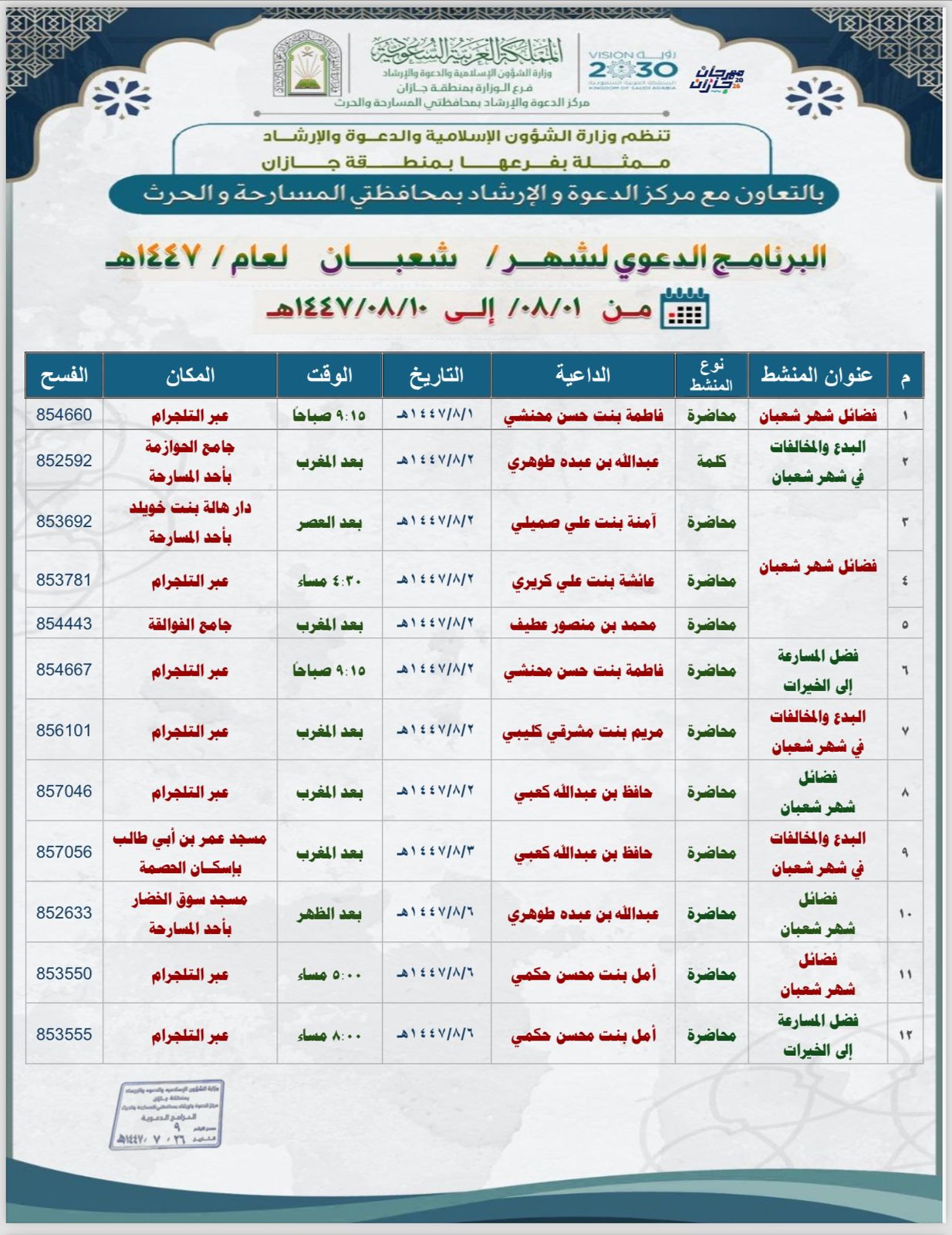 الشؤون الإسلامية بجازان تُنظّم برنامجًا دعويًا نسائيًا بمحافظتَي المسارحة والحُرّث خلال شهر شعبانتُنظّم وزارةُ الشؤون الإسلامية والدعوة والإرشاد، ممثّلةً بفرعها في منطقة جازان، مركز الدعوة والإرشاد بمحافظتَي المسارحة والحُرّث، برنامجًا دعويًا نسائيًا خلال الفترة من الأول وحتى العاشر من شهر شعبان 01/شعبان/1447 التفاصيل
