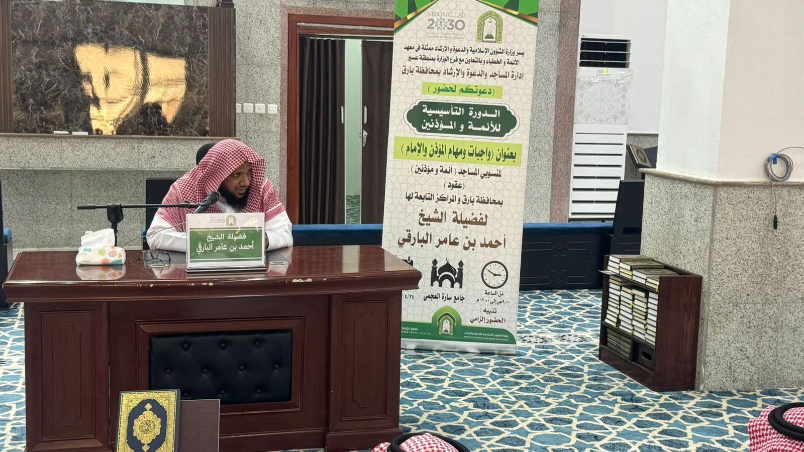 الشؤون الإسلامية تنفذ الدورة التأسيسية للأئمة والمؤذنين بعنوان "واجبات ومهام المؤذن والإمام" بمحافظة بارقنفذت وزارة الشؤون الإسلامية والدعوة والإرشاد، ممثلة بمعهد الأئمة والخطباء، يوم الخميس الماضي الرابع والعشرون من شهر ربيع الآخر ١٤٤٧ هـ، الدورة التأسيسية للأئمة والمؤذنين بعنوان: "واجبات ومهام التفاصيل