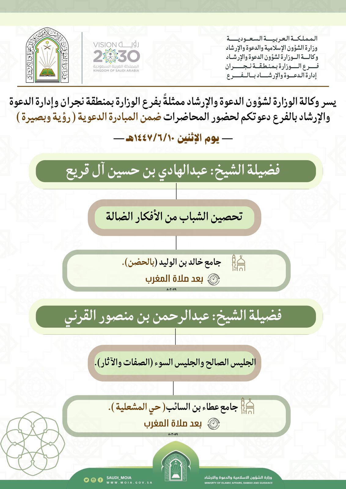 ​تُنفّذ وزارة الشؤون الإسلامية والدعوة والإرشاد، ممثلةً بفرعها في منطقة نجران، بإدارة الدعوة والإرشاد ، اليوم الإثنين العاشر من شهر جمادى الآخرة لعام 1447هـ، سلسلة من المحاضرات الدعوية ضمن مبادرة "​رؤية وبصيرة"، وذلك في عددٍ من الجوامع والمساجد بالمنطقة ومحافظة شرورة، وبمشاركة نخبة من العلماء والدعاة.