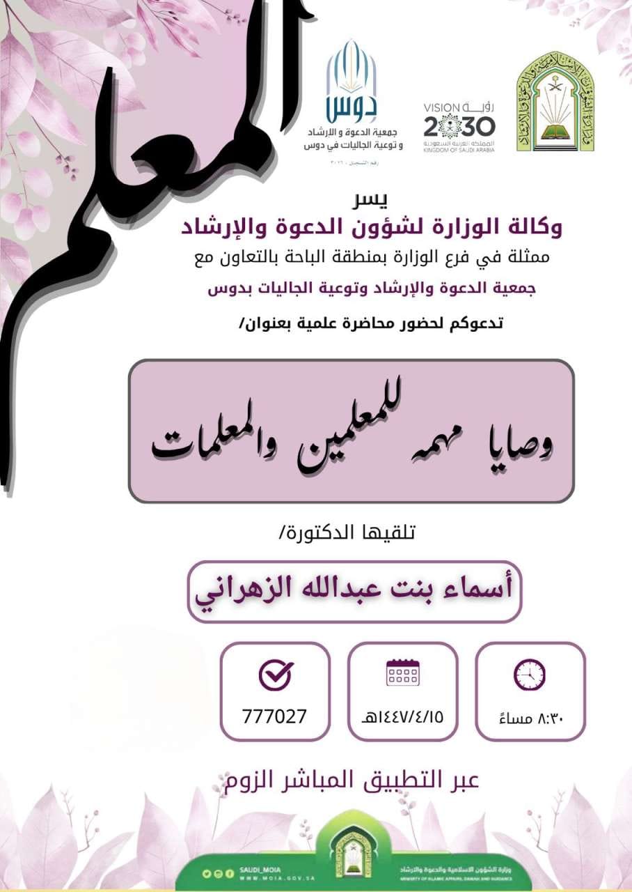 أخبار الشؤون الإسلامية بالباحة تنفذ كلمتين توعويتين ببلخزمر تزامناً مع اليوم العالمي للمعلمنفّذ فرع وزارة الشؤون الإسلامية والدعوة والإرشاد بمنطقة الباحة، بالتعاون مع جمعية الدعوة والإرشاد وتوعية الجاليات ببلخزمر، يوم أمس الثلاثاء الخامس عشر من شهر ربيع الآخر لعام 1447هـ، كلمتين توعويتين ... التفاصيل