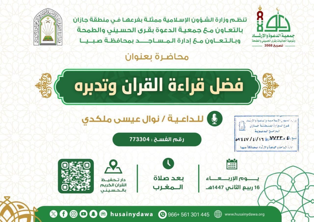 أخبار مناشط دعوية نسائية تنفذها الشؤون الإسلامية في جازان بمدينة جيزان ومحافظة ضمدينفذ فرع وزارة الشؤون الإسلامية والدعوة والإرشاد في منطقة جازان ممثلاً بمركز الدعوة بمدينة جيزان يوم الثلاثاء الخامس عشر من شهر ربيع الثاني لعام 1447هـ، محاضرة دعوية نسائية في مسجد زيد بن ثابت، تتناول ... التفاصيل